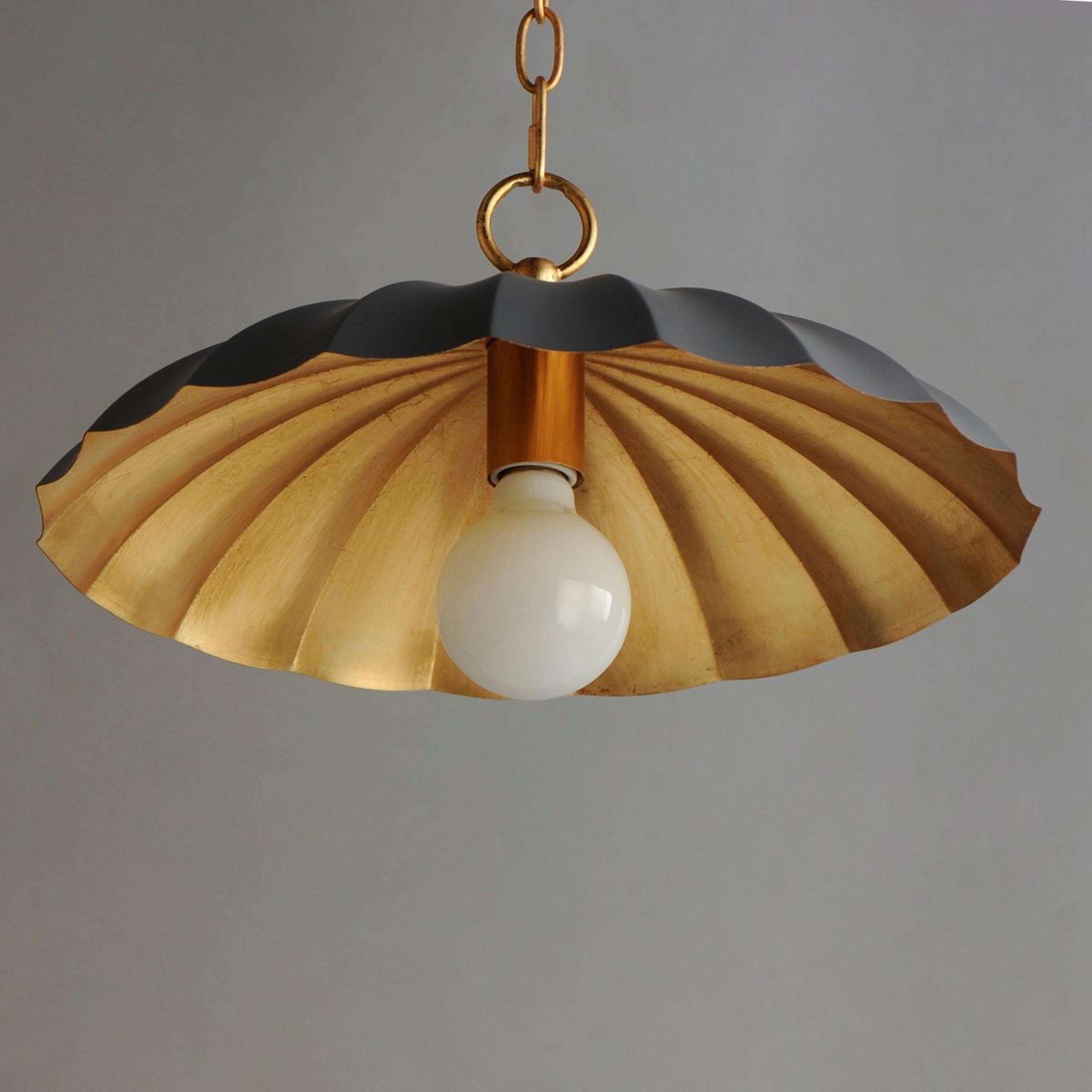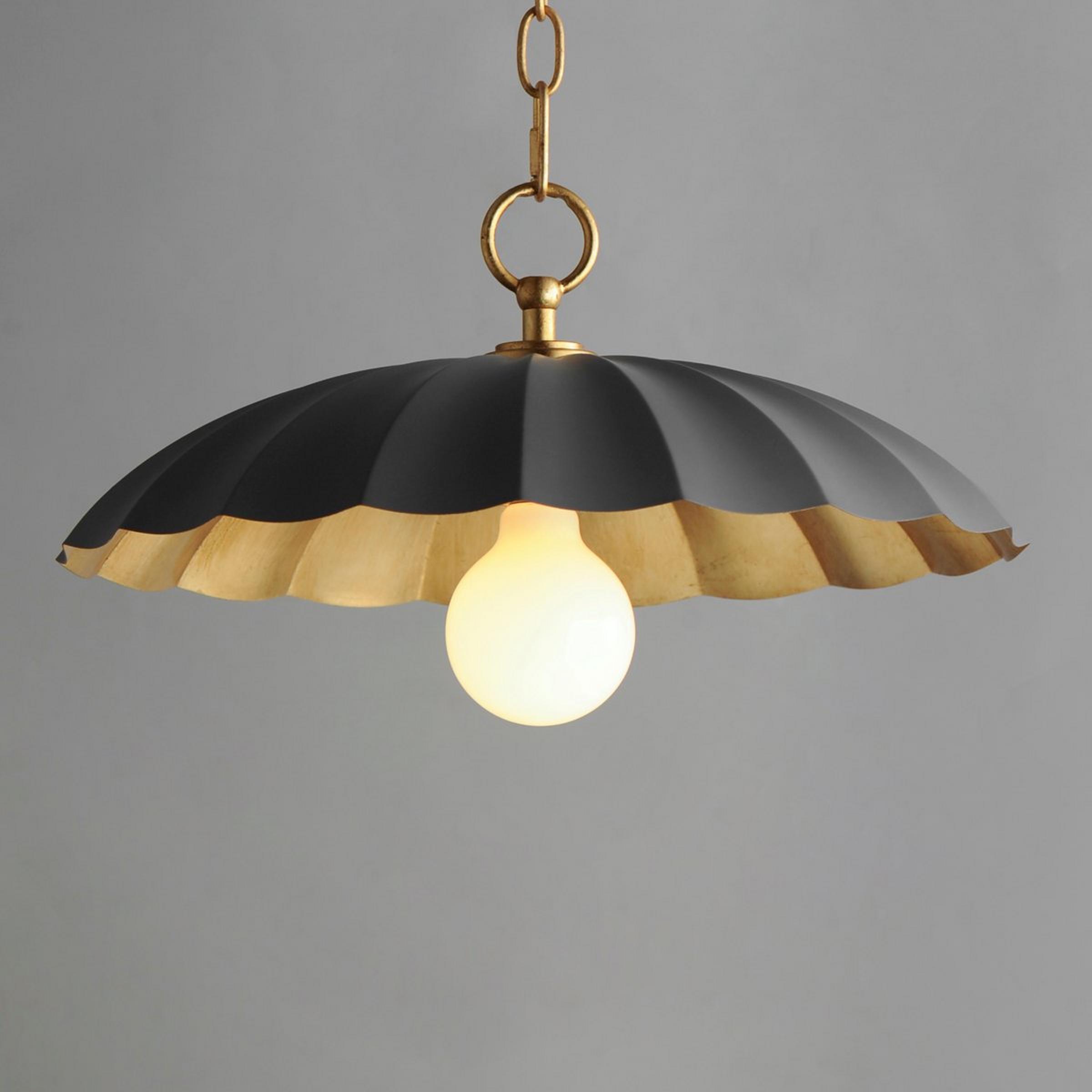 Dainty and decorative, this pendant playfully beautifies a room with a scalloped shade inspired by vintage fixtures. The color of the shade exterior contrasts the luxurious hand-applied gold leaf finish of the canopy and shade interior, creating a striking accent for any home. Please note that due to the hand-crafted nature of the gold leaf finish, minor imperfections, such as a subtle crackle effect, should be expected and celebrated.