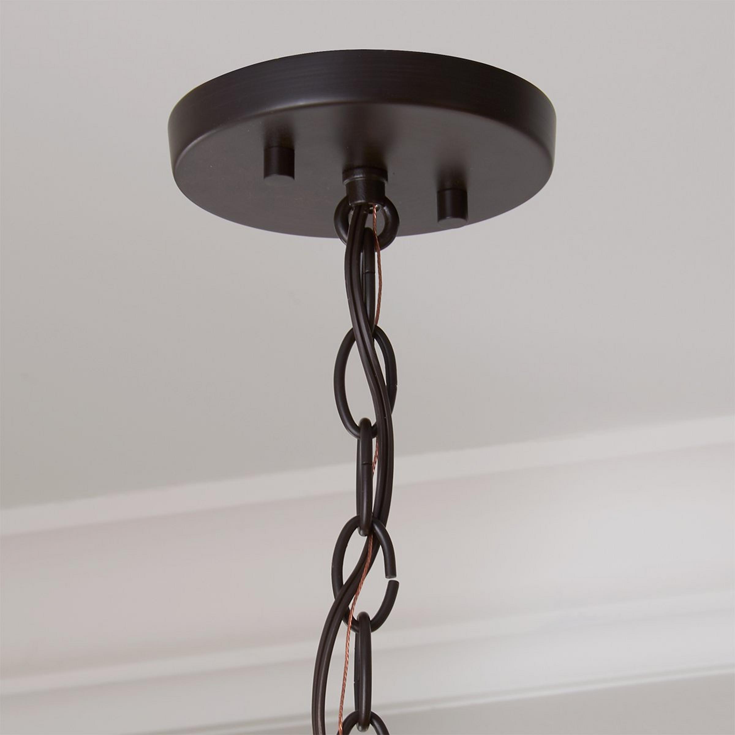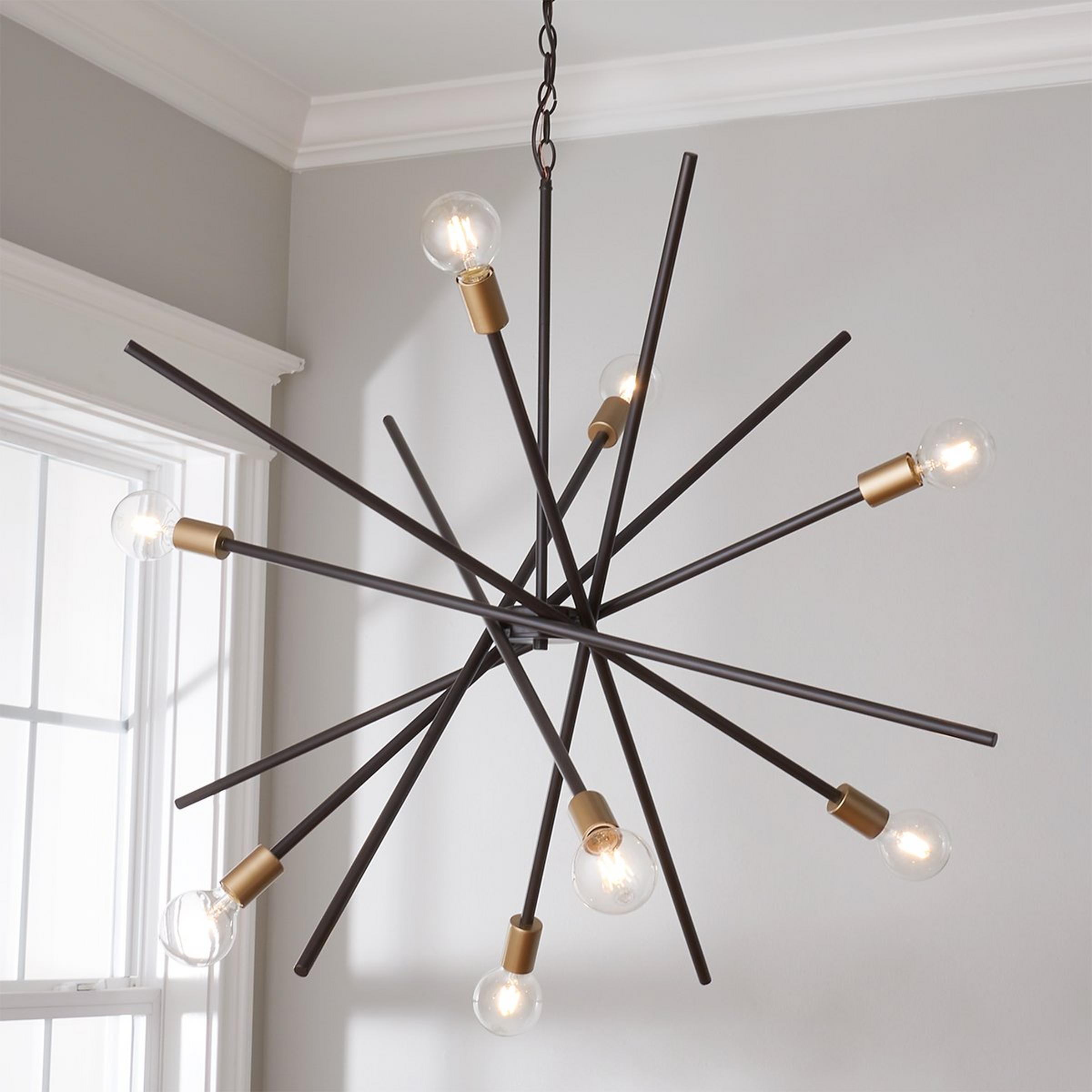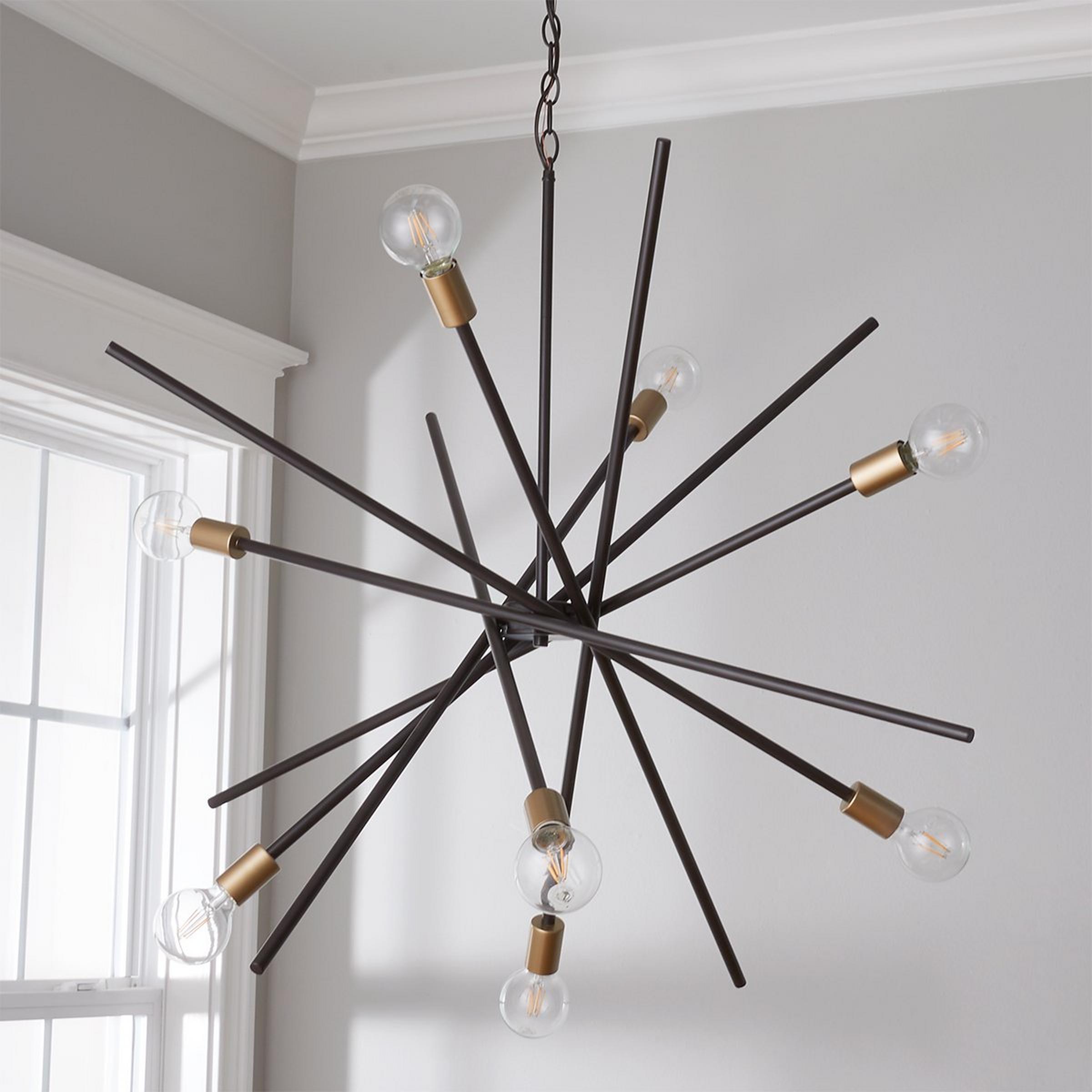 Eight bars capped in lamps are scattered haphazardly around the body of this chandelier which channels a beautiful chaos. The apparent randomness of the arrangement of the bars lends an attractive discord to modern and minimalist rooms.