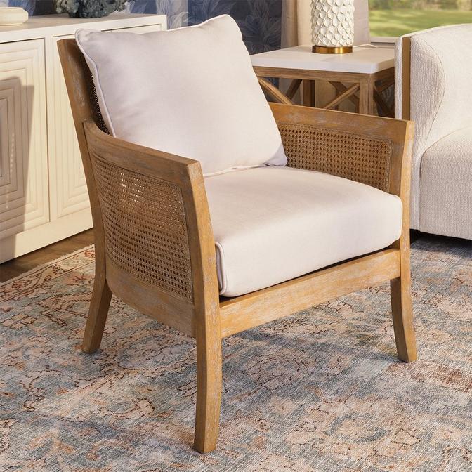 The Schiller Accent Chair exudes grandeur with its high back and gracefully curved arms. It is finished in gray wash wood and features elegantly caned sides. The plush seat and back are adorned in durable yet luxurious off-white fabric, designed with performance treatment to repel soiling and stains.
