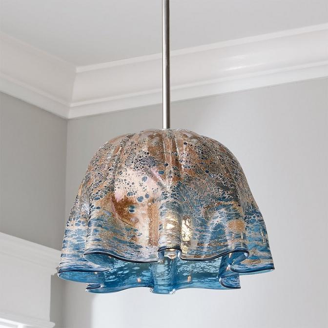 This textured art glass pendant is reminiscent of the sea at the crest of a wave. Perfect for a beach retreat, or any home where you want to bring the feel of the beach. Due to the nature of this art glass no two will be exactly alike in color, pattern, or shape. This pendant is assembled by hand in our Richmond, Virginia production facility.