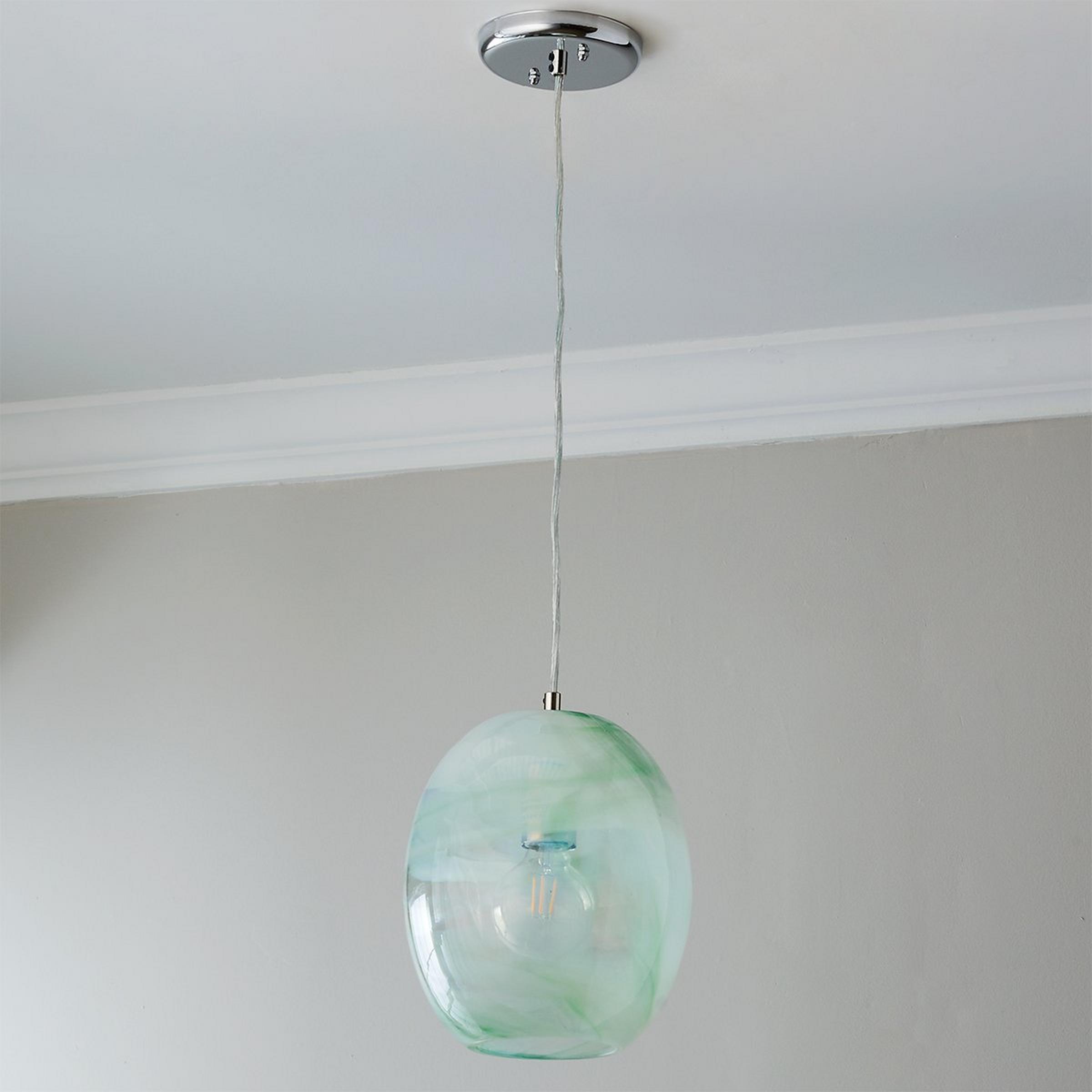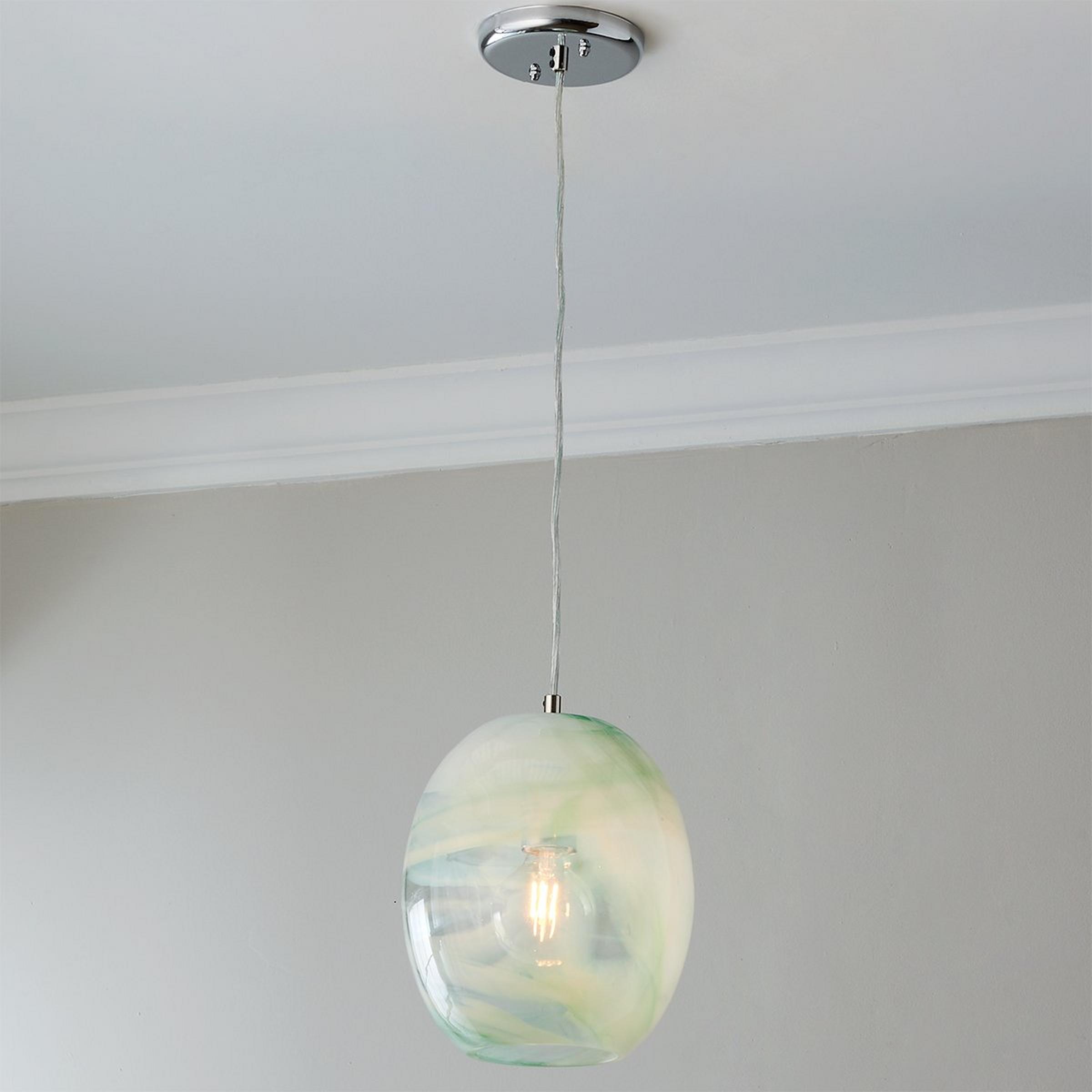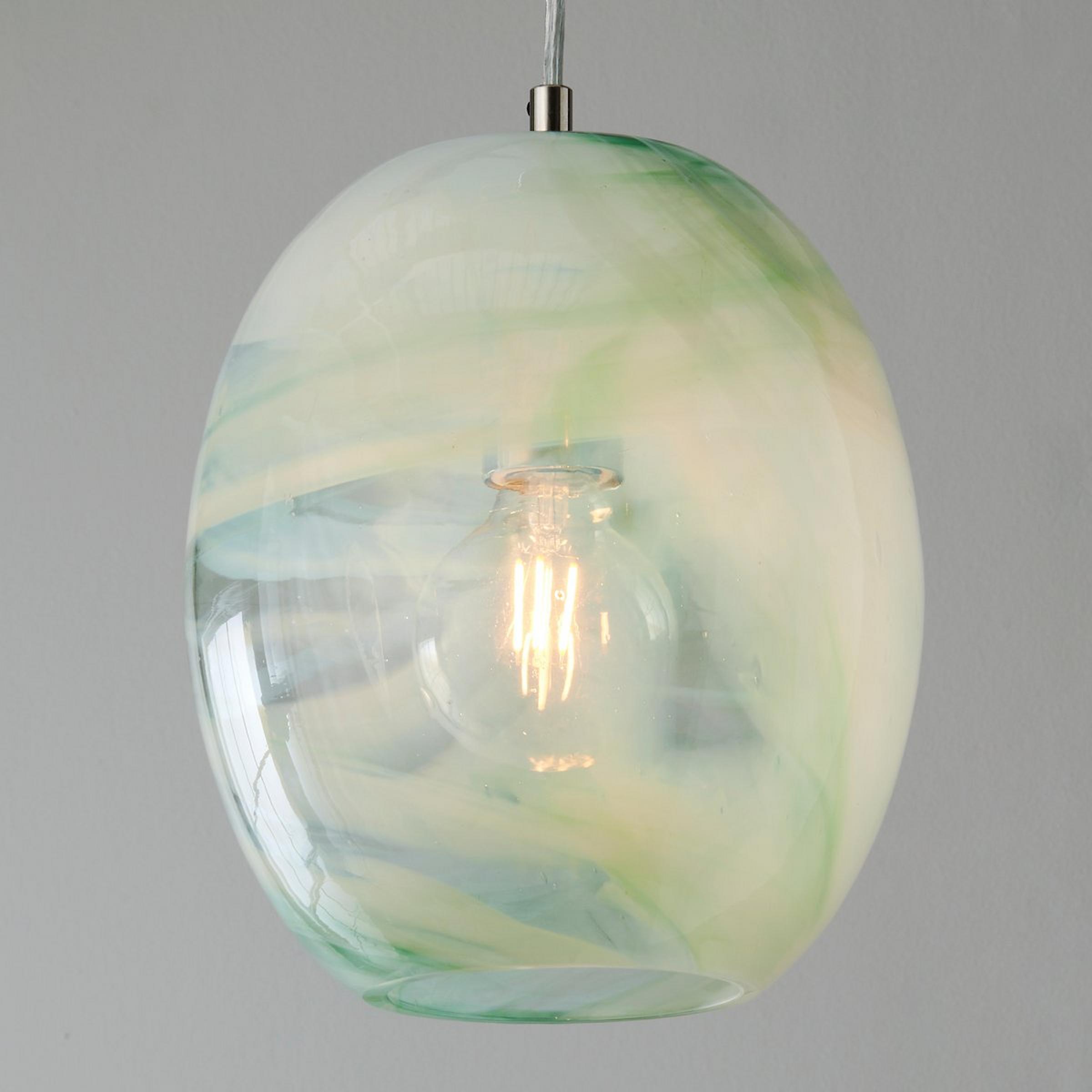 Tinged with pastel hues, the Seafoam Swirl Pendant adds an elegant pop of color to any modern or transitional space. Like jewelry for your ceiling, this glass pendant makes a fabulous addition to any entryway, kitchen, or dining room. This fixture is assembled by hand in our Richmond, Virginia production facility.