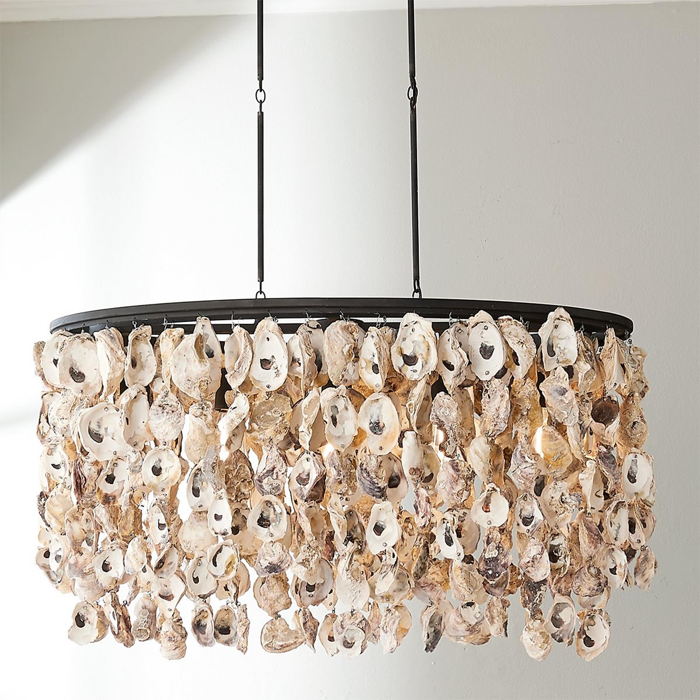 With strings of oyster shells hanging from a minimalist Wrought Iron frame, seaside allure dominates this beautiful island chandelier. This bold coastal look is sure to bring beachy charm to any nautically themed space.
