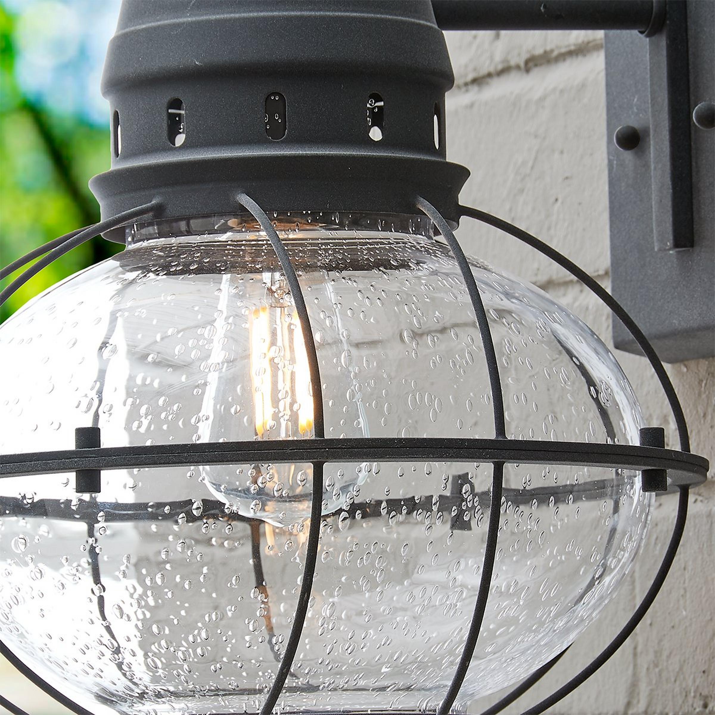 This outdoor wall lantern boasts classic nautical and railway styling with a beautiful seeded glass globe and a vintage Weathered Zinc finish.