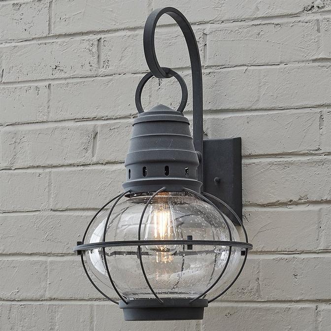 This outdoor wall lantern boasts classic nautical and railway styling with a beautiful seeded glass globe and a vintage Weathered Zinc finish.