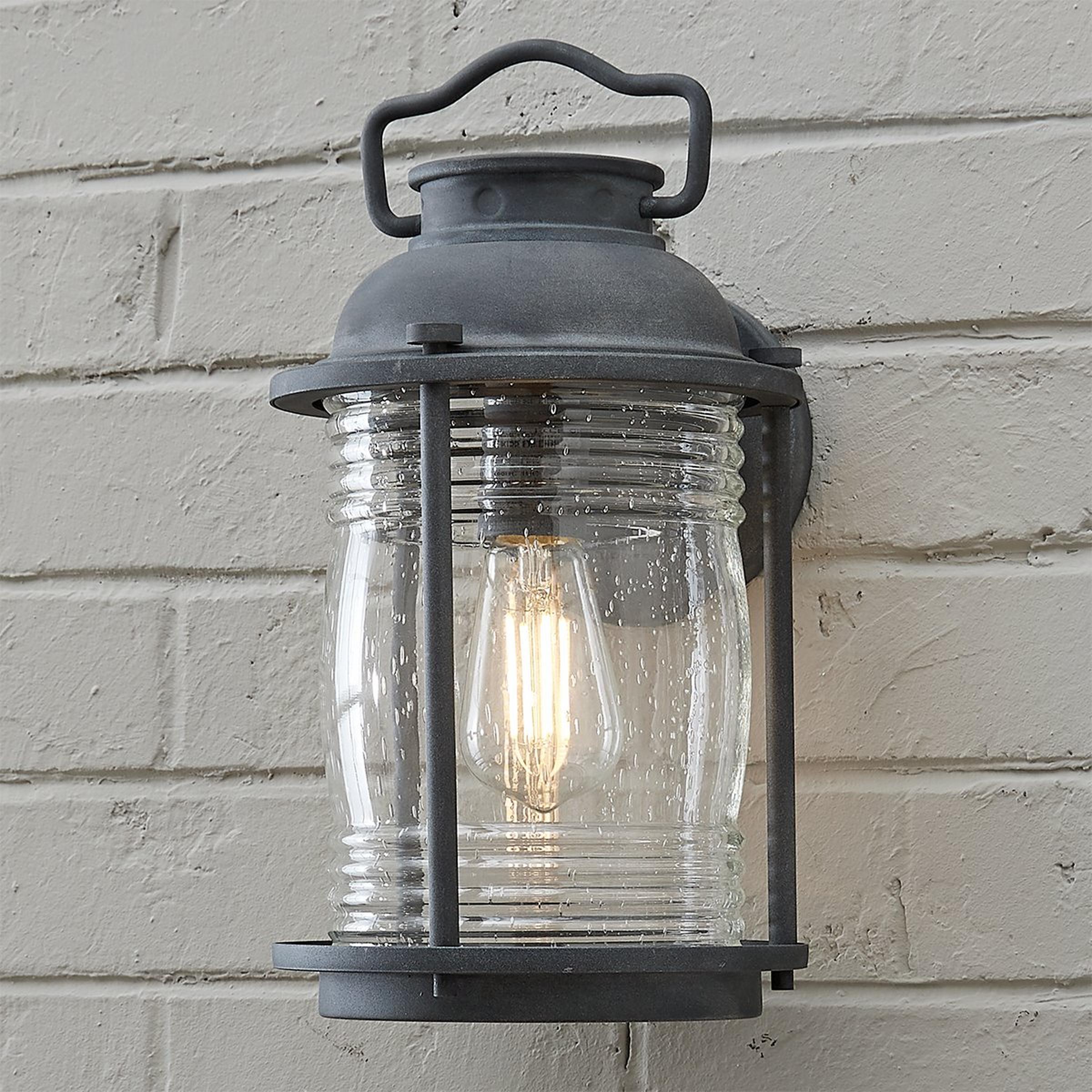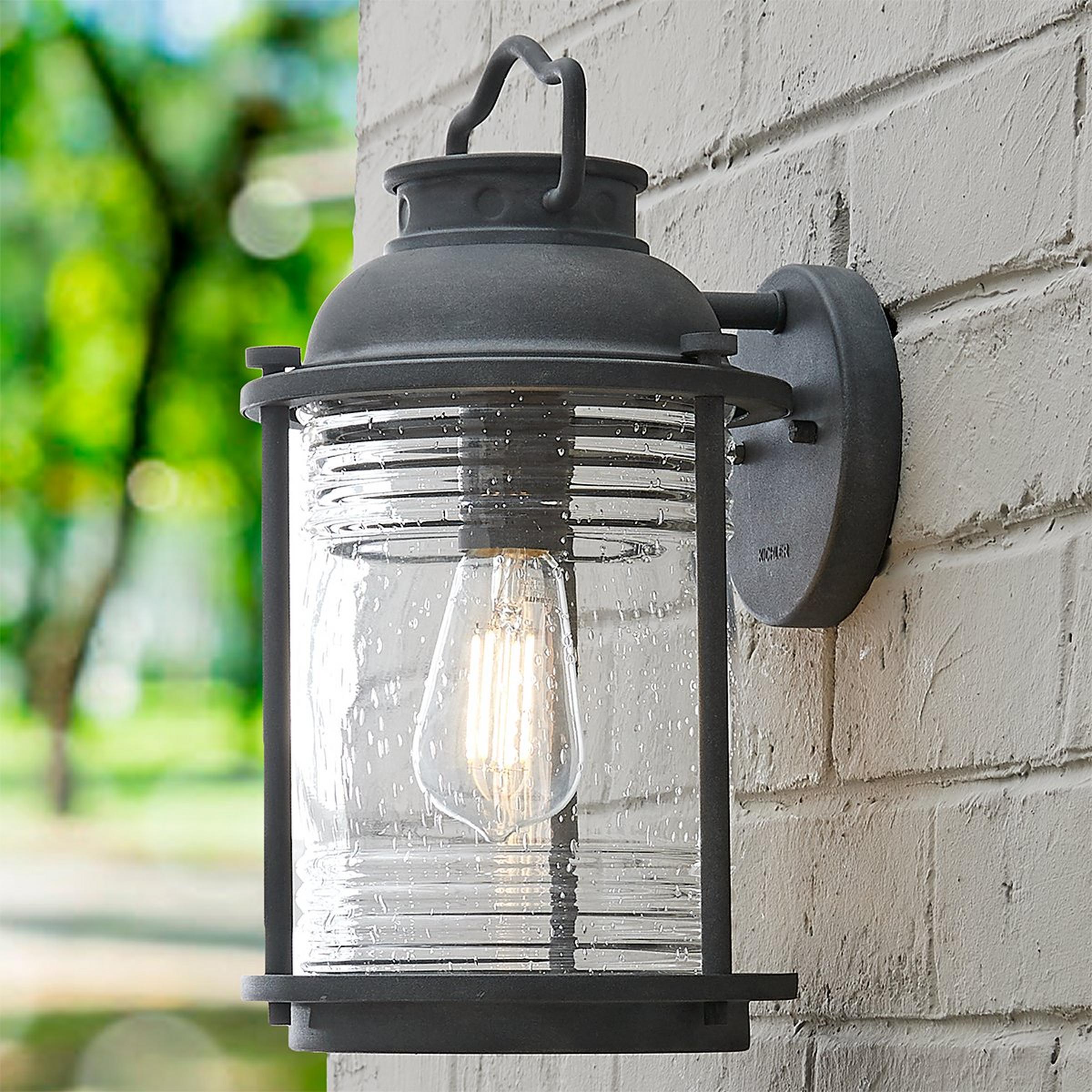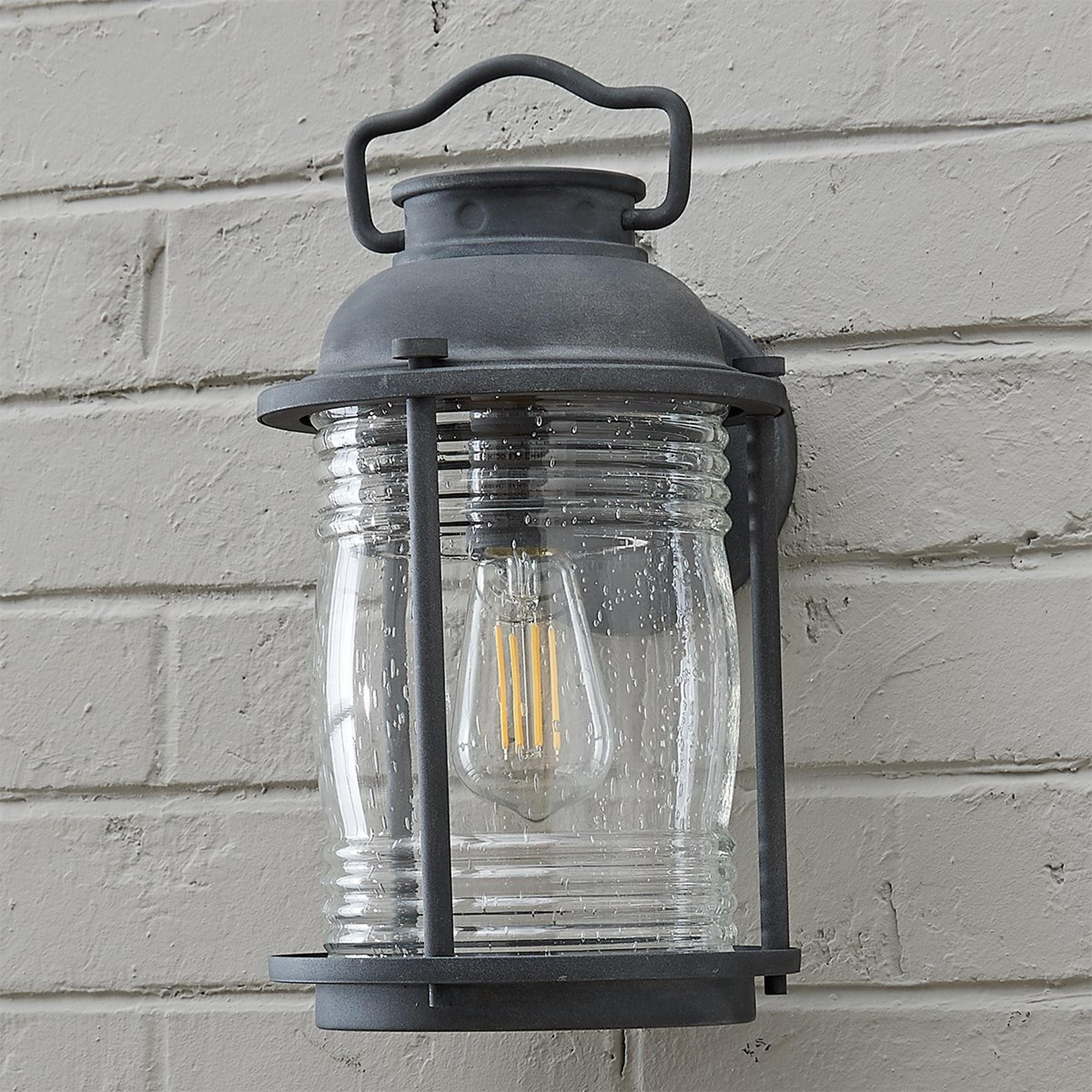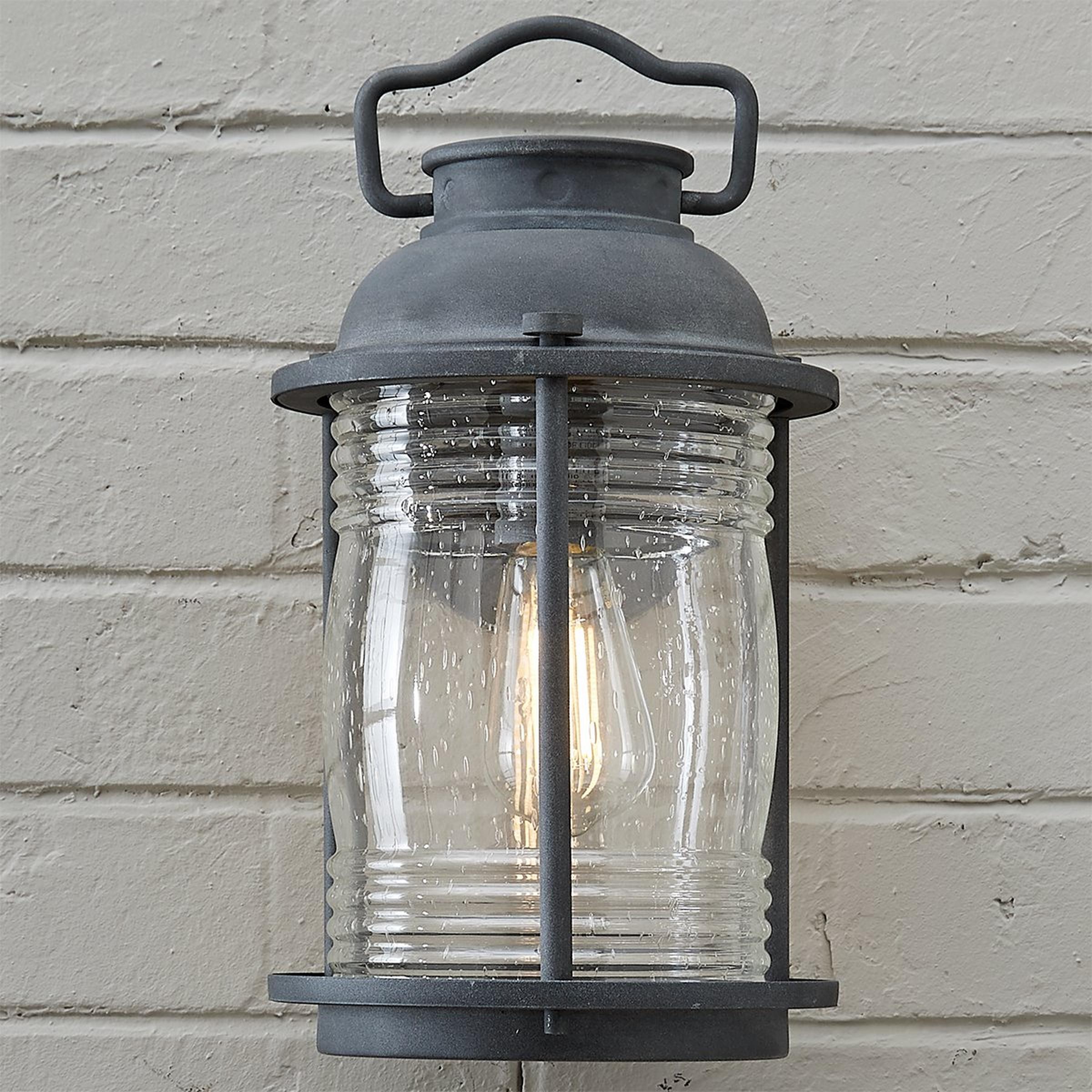 The shape of this outdoor sconce evokes handheld lanterns while the beautiful ribbed seeded glass and Weathered Zinc finish reinforce the vintage motif.