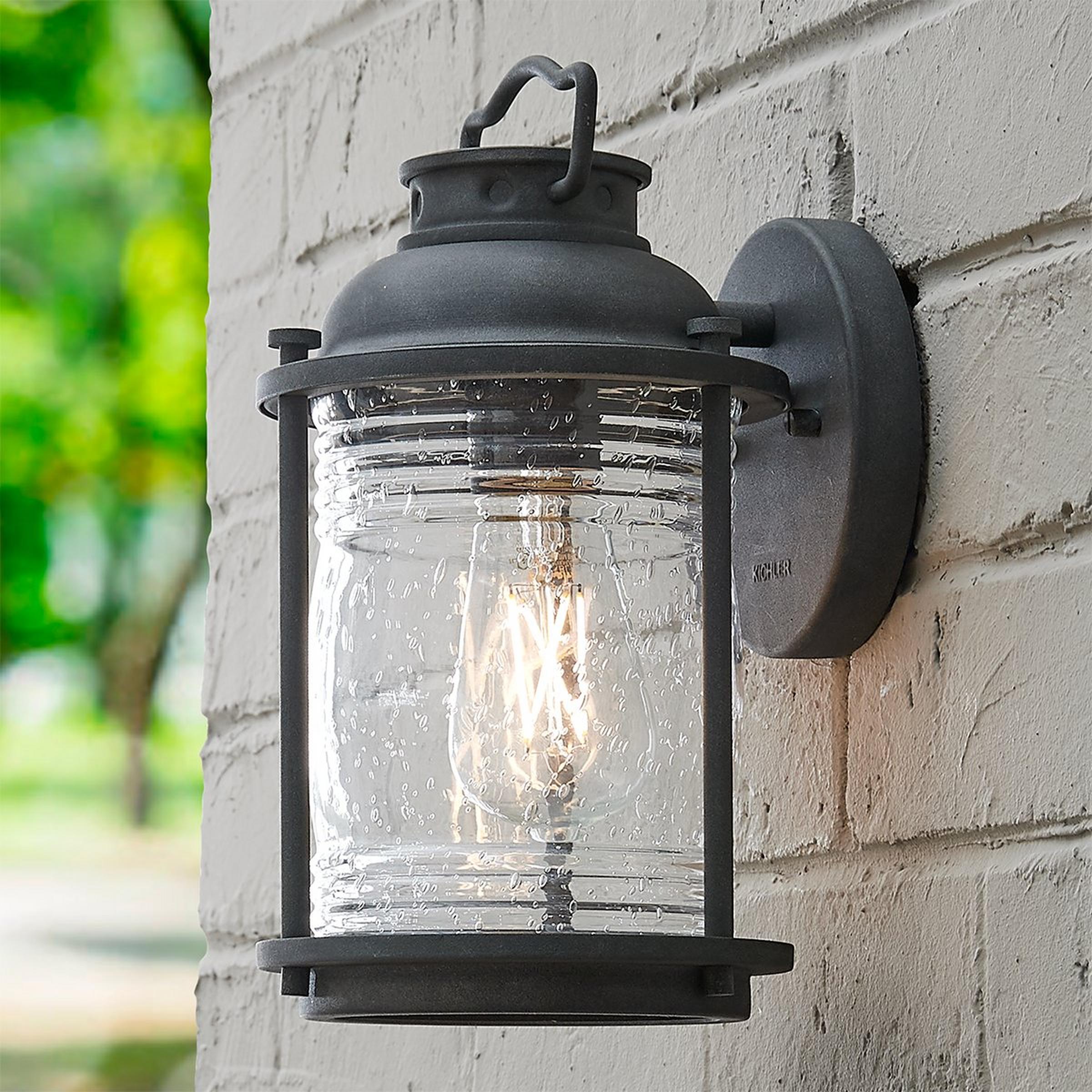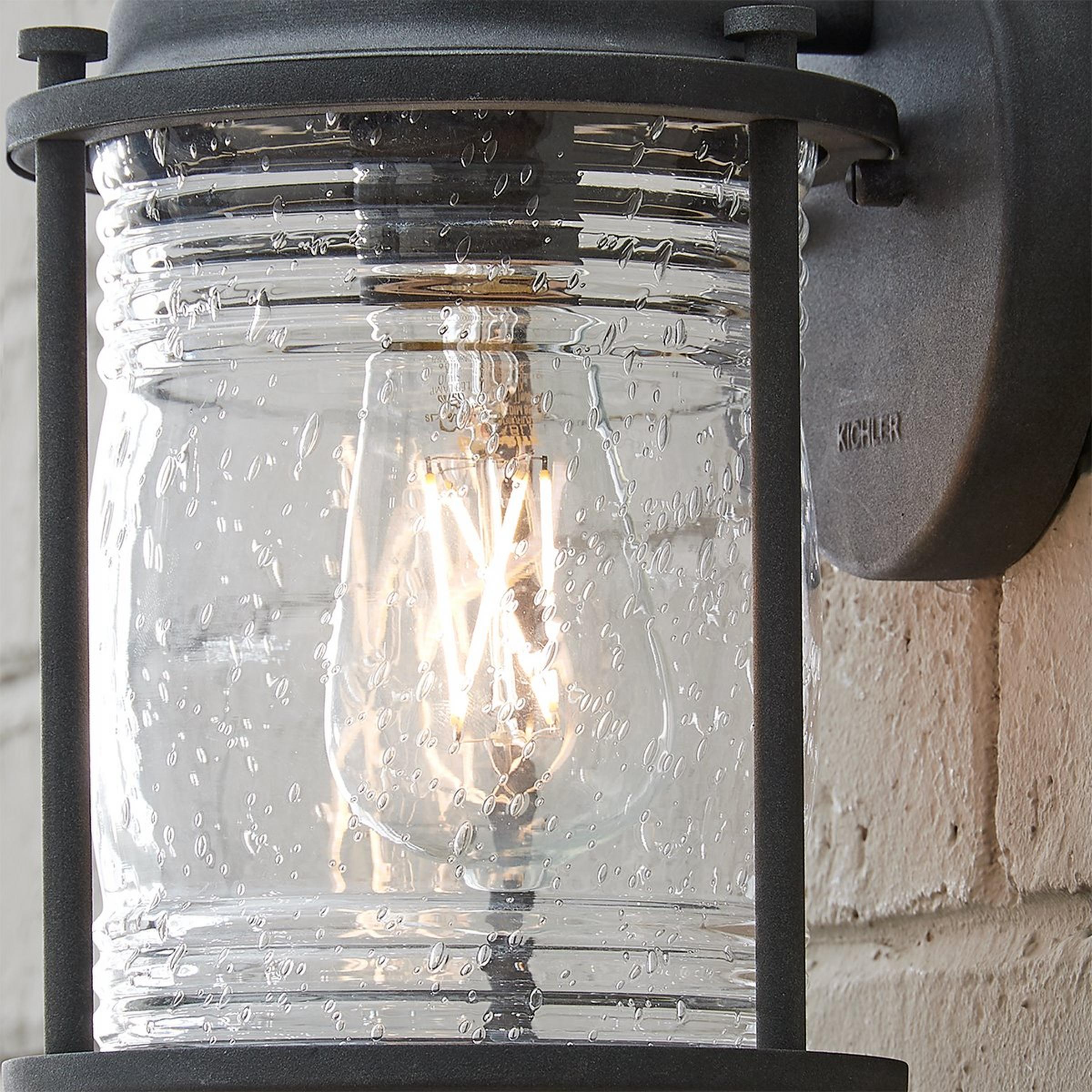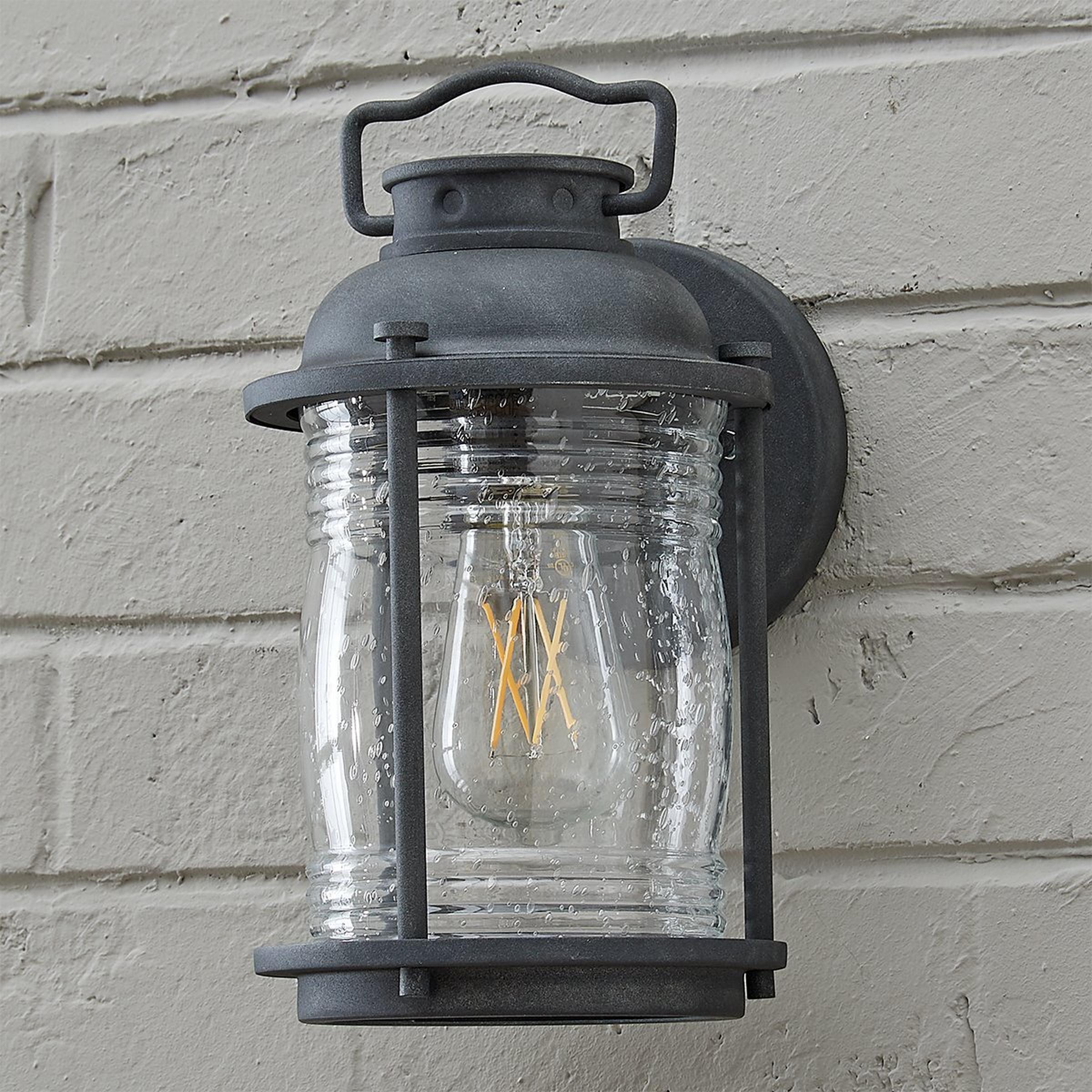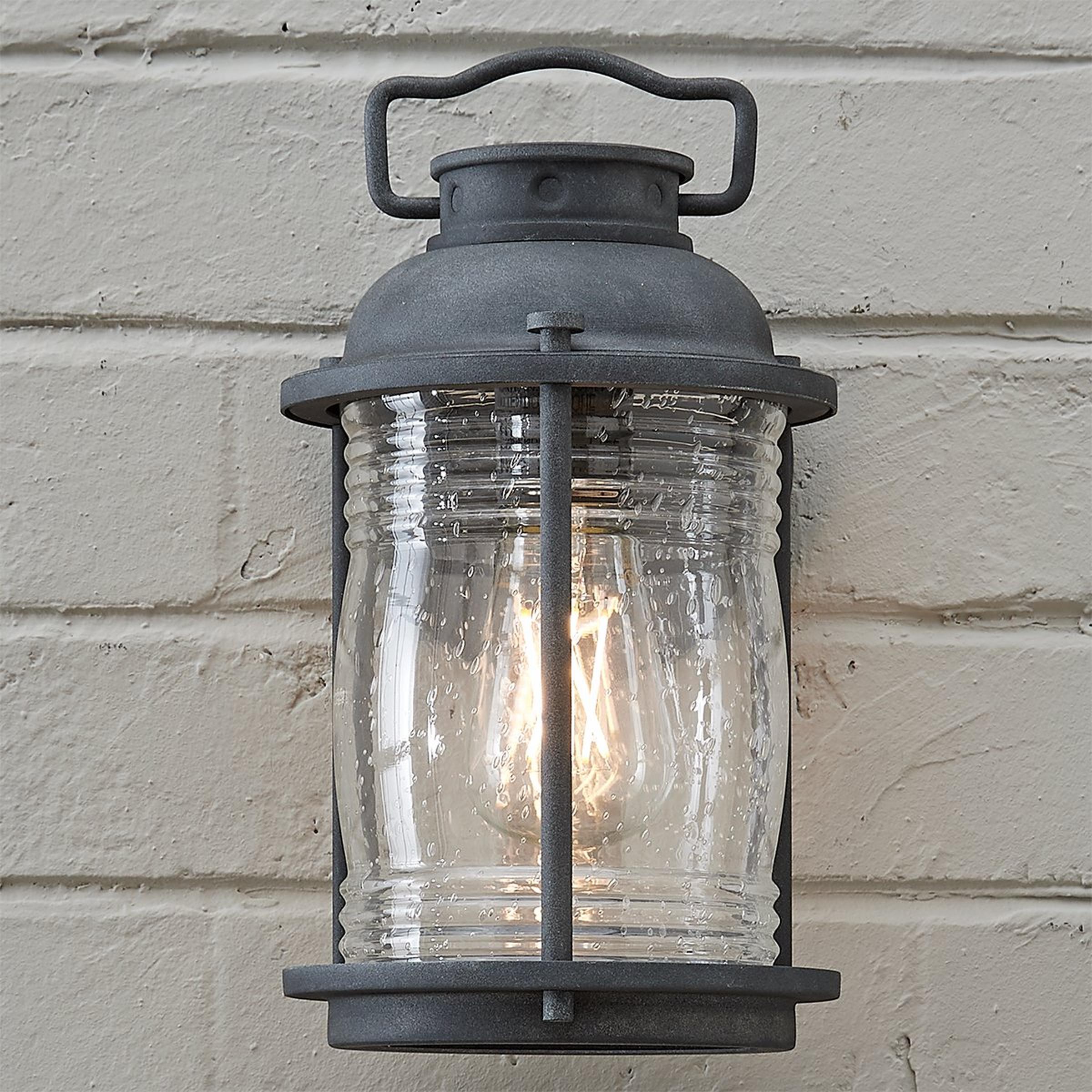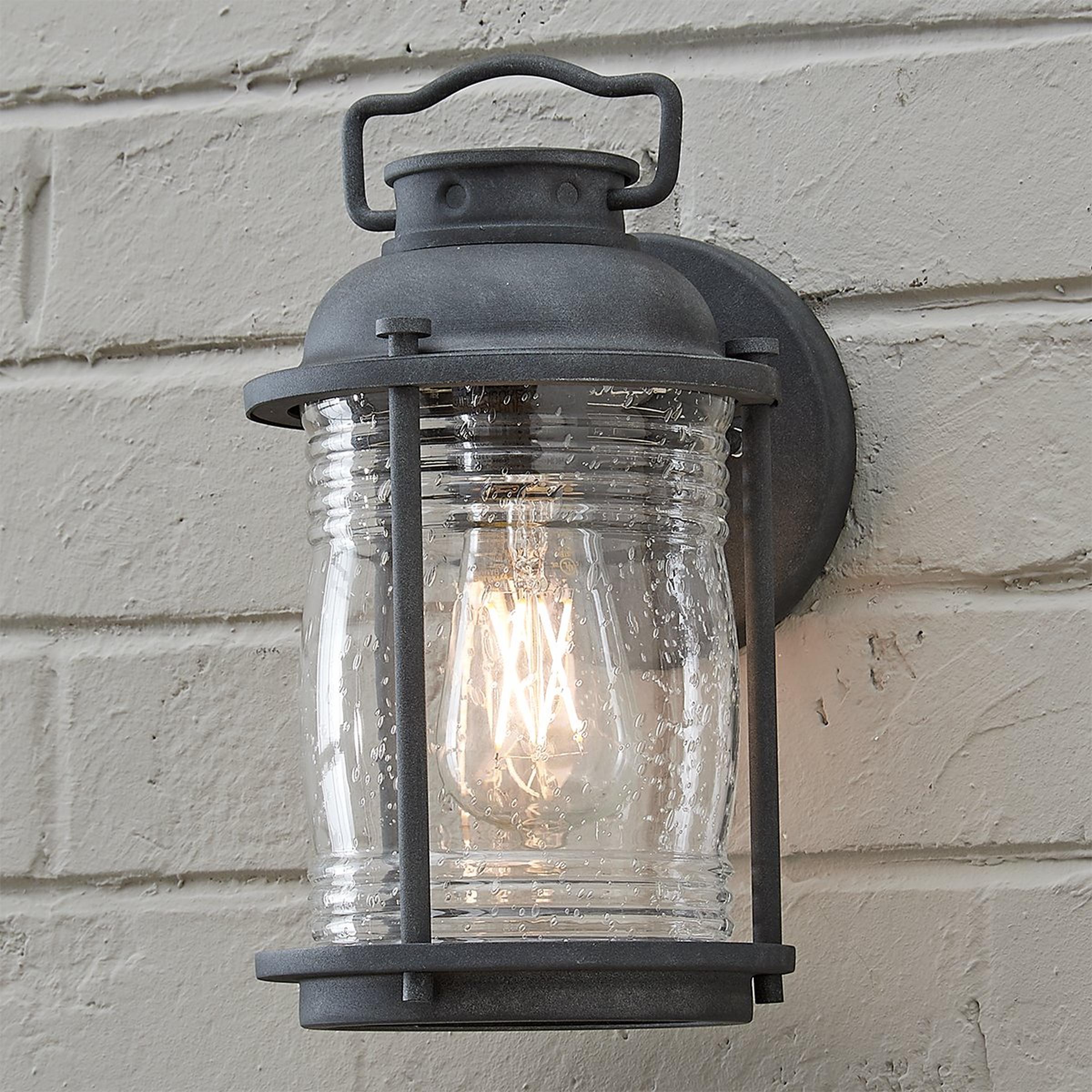 The shape of this outdoor sconce evokes handheld lanterns while the beautiful ribbed seeded glass and Weathered Zinc finish reinforce the vintage motif.