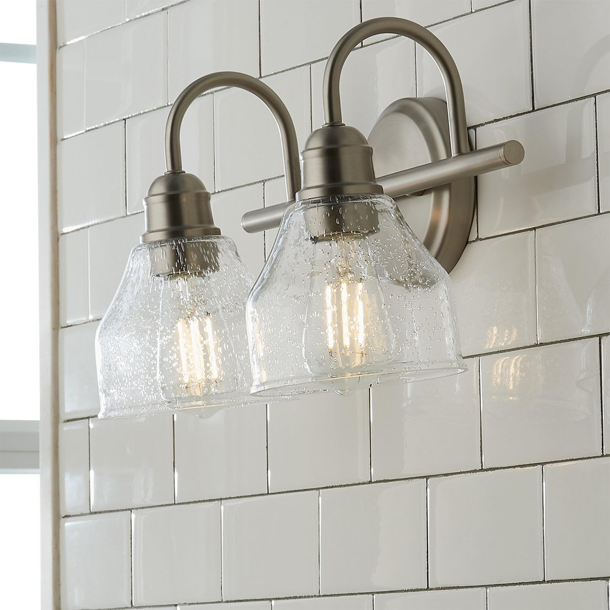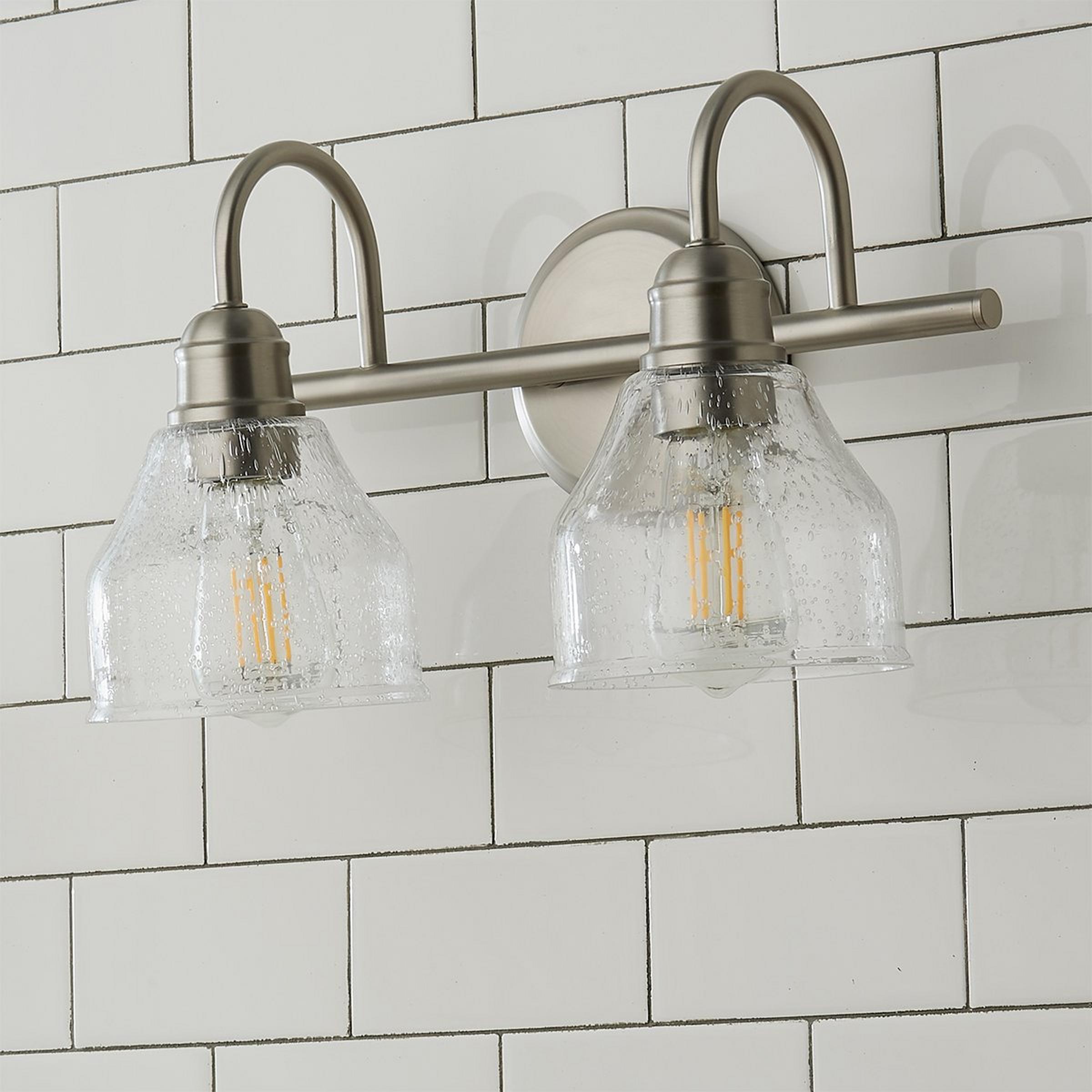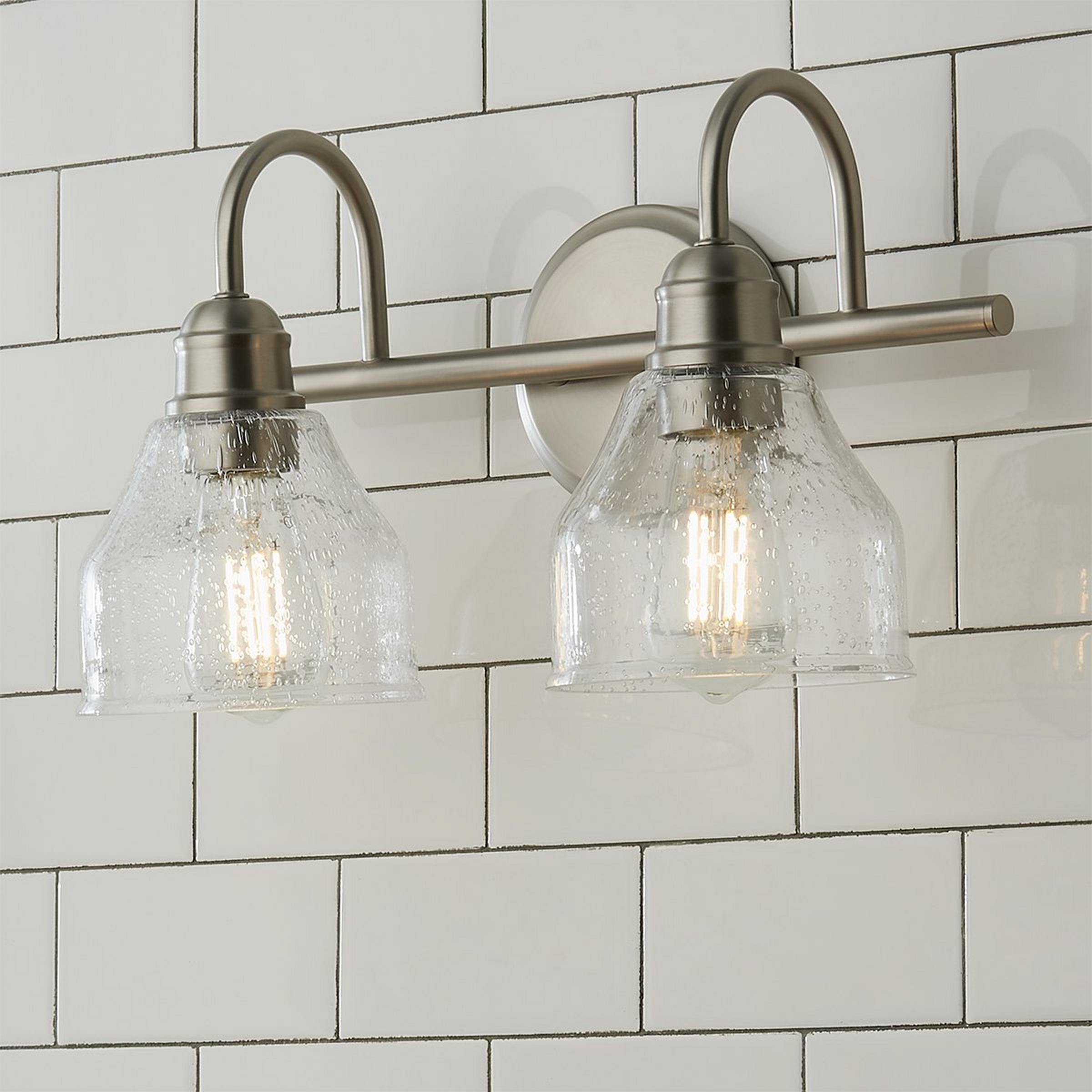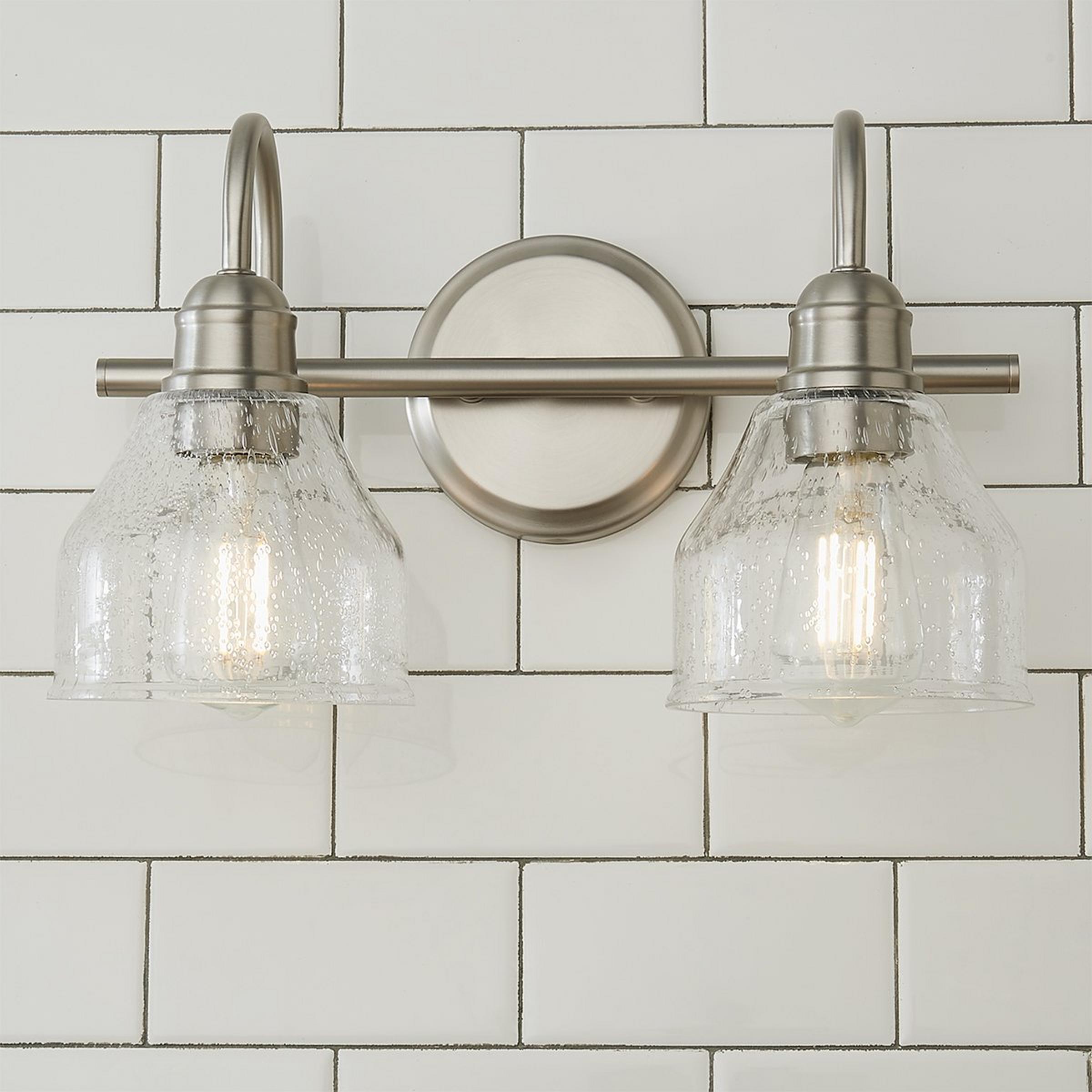 Tapered seedy glass shades elevate this bath light collection in elegant style. Our Seedy Gooseneck Collection features dramatic curved arms that hold the light firmly in place to sufficiently brighten your transitional bathroom.