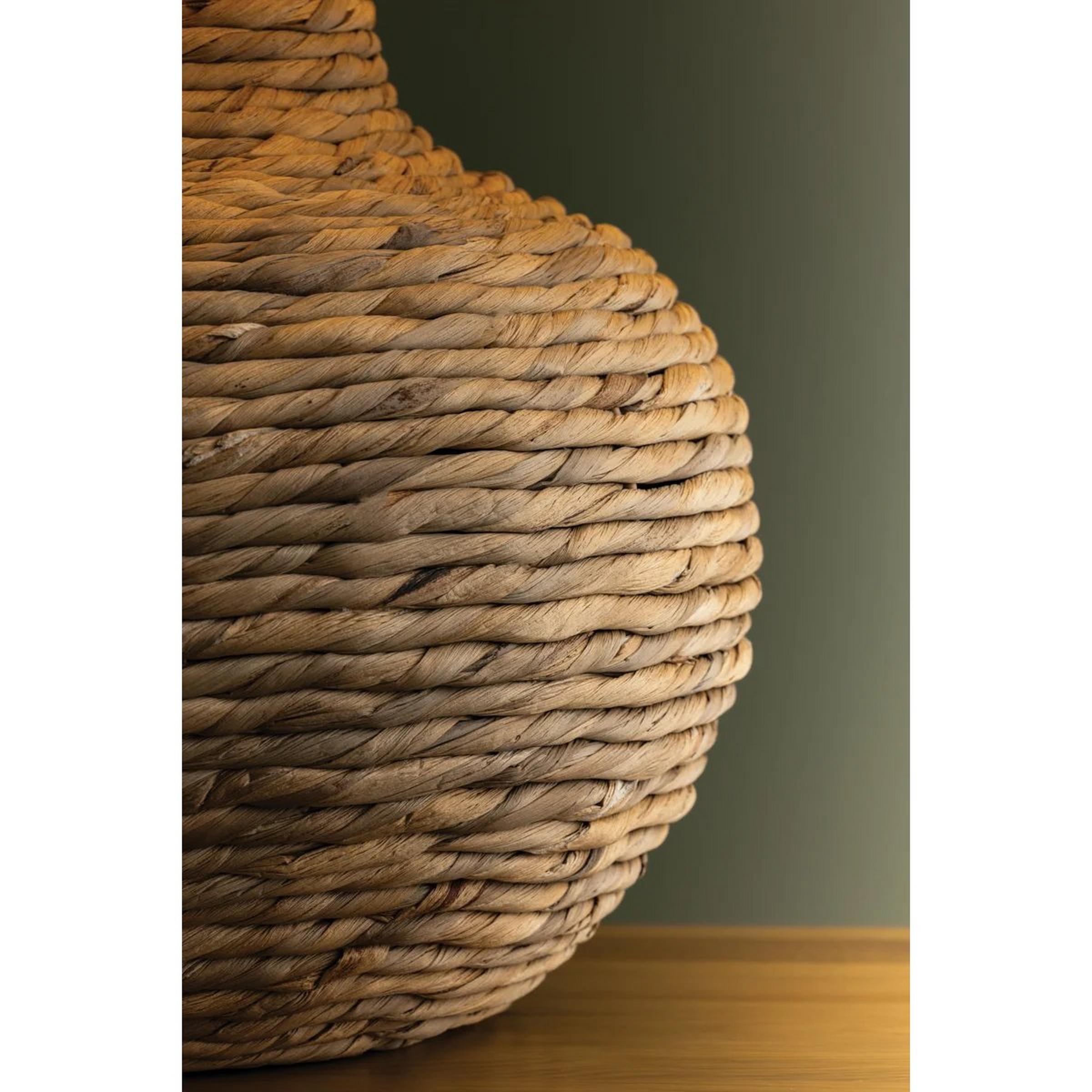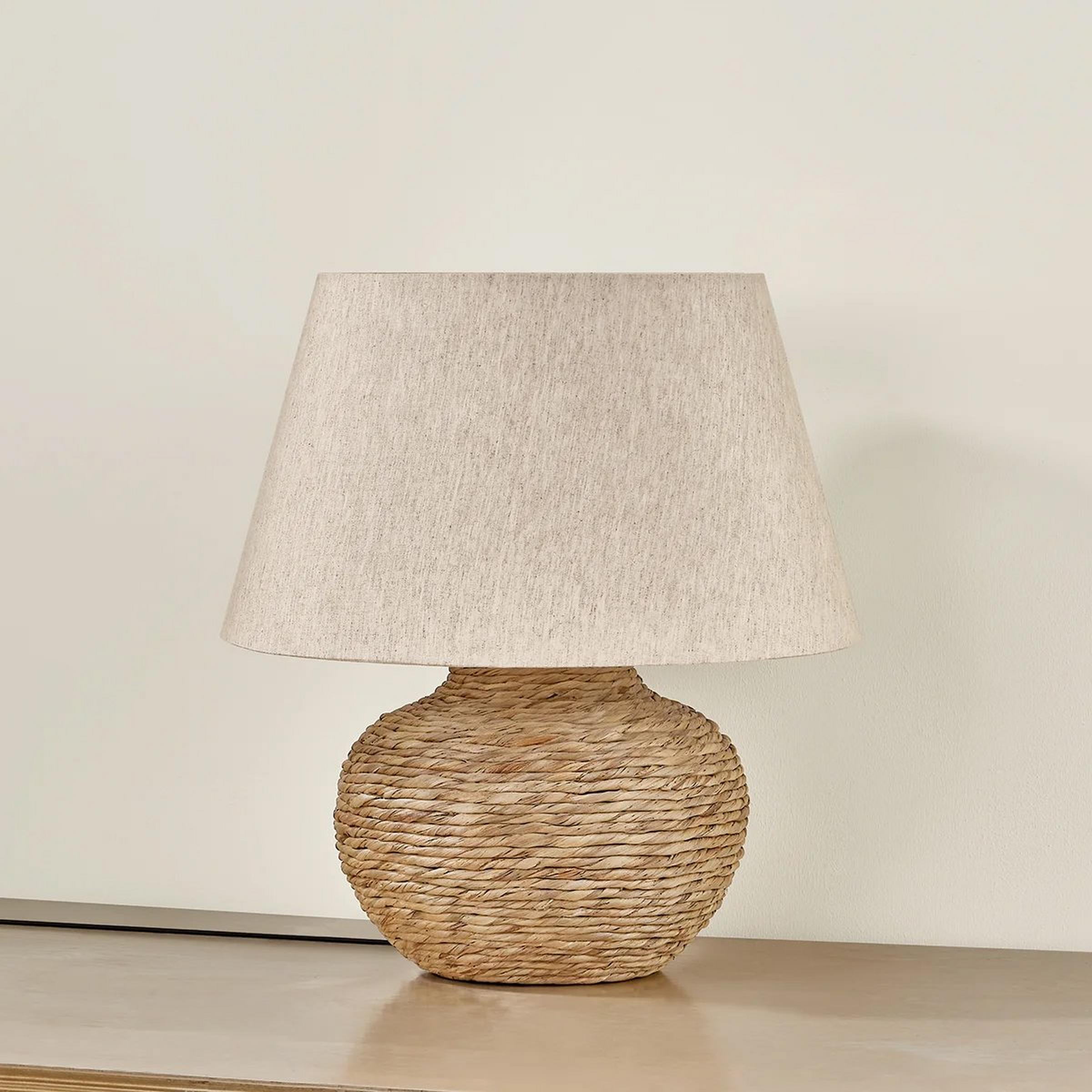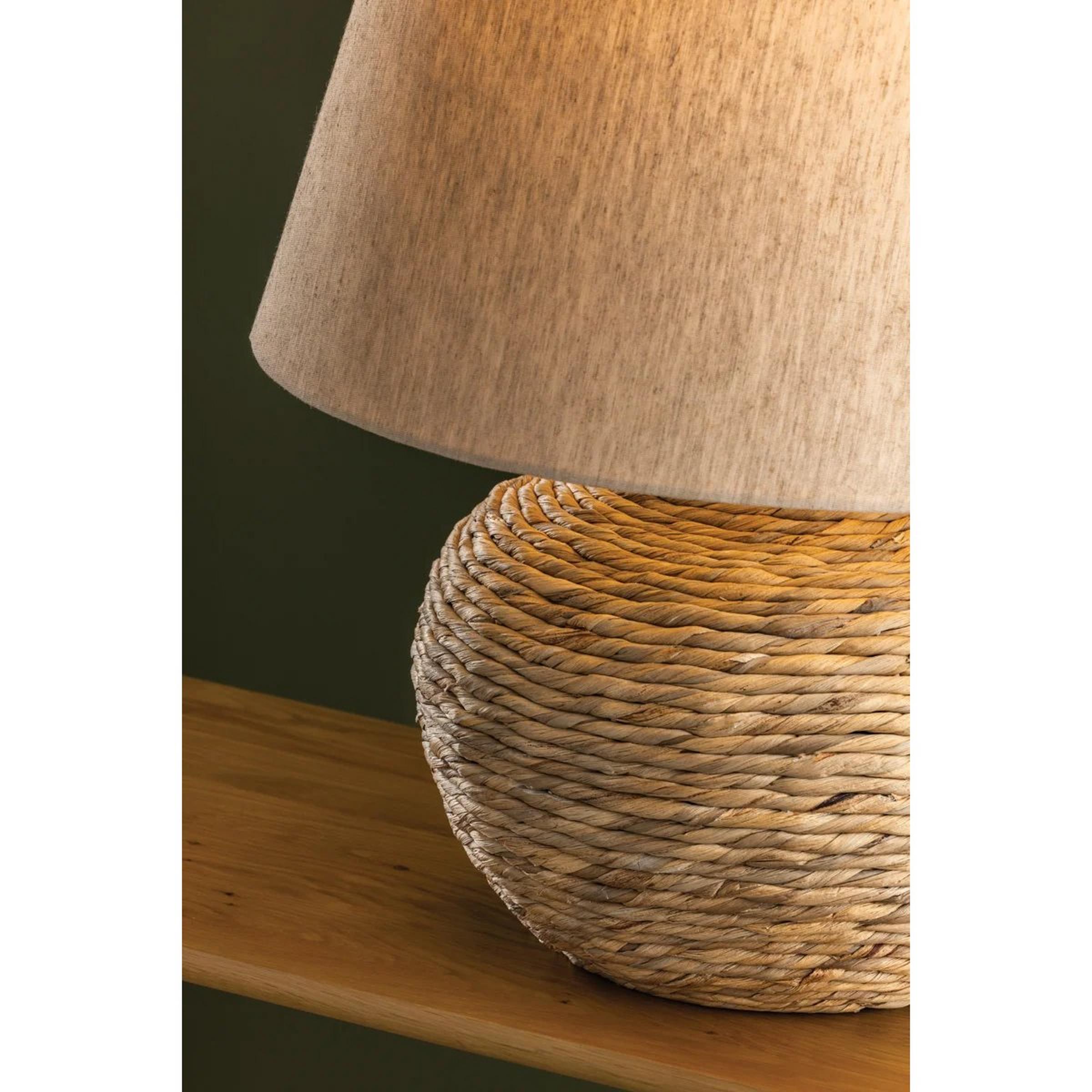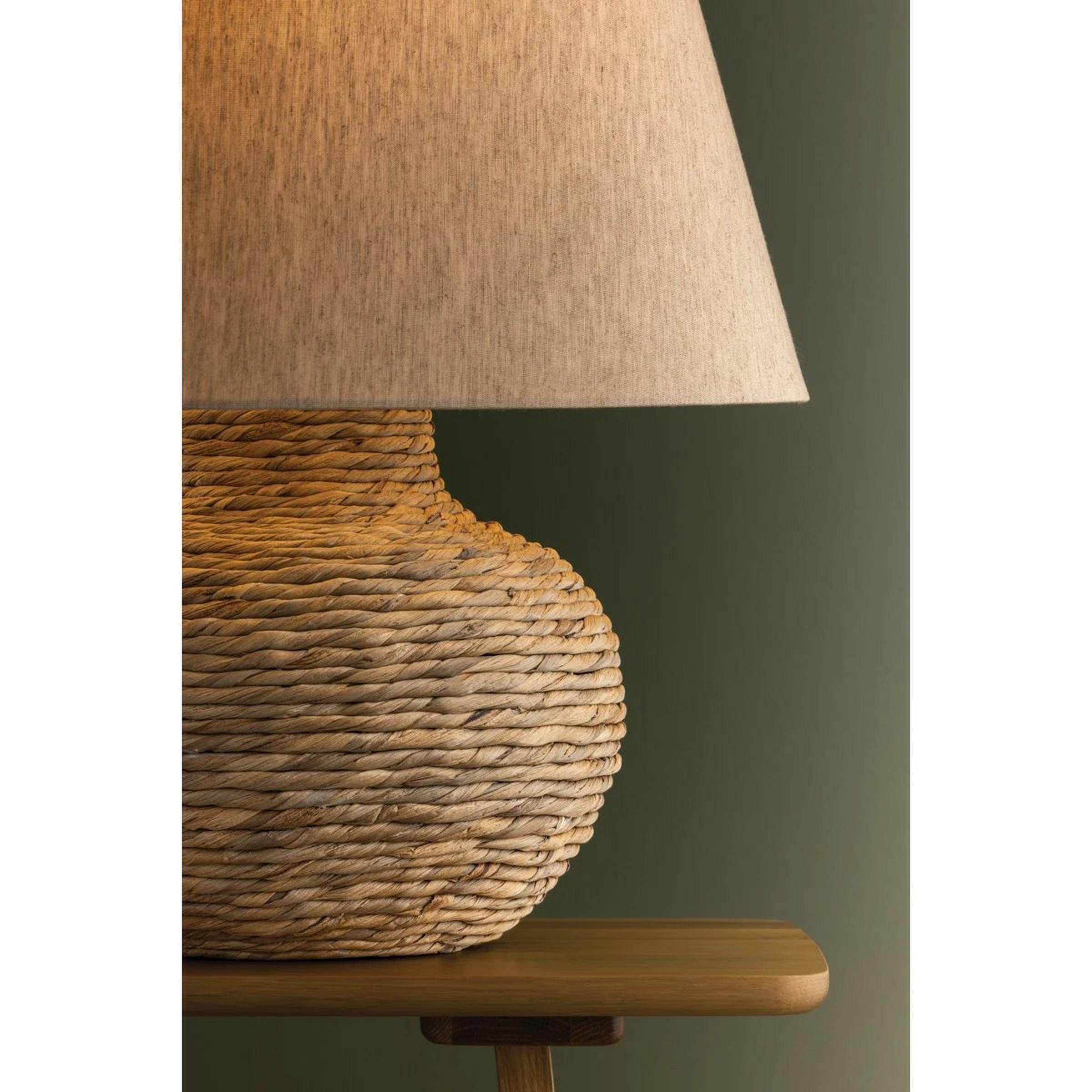 This generously wide table lamp offers functional lighting and serves as stylish accent décor in any living space or dining room. The body of the lamp is wrapped in a rope made of the fibers of natural water hyacinth. Paired with a warm linen shade, this lamp utilizes texture and tone in harmony to illuminate your space. The shade and base work in tandem, forming a cohesive silhouette; the shade tapers gently outward while the bulbous base, curving beautifully, swoops back inward toward the bottom.