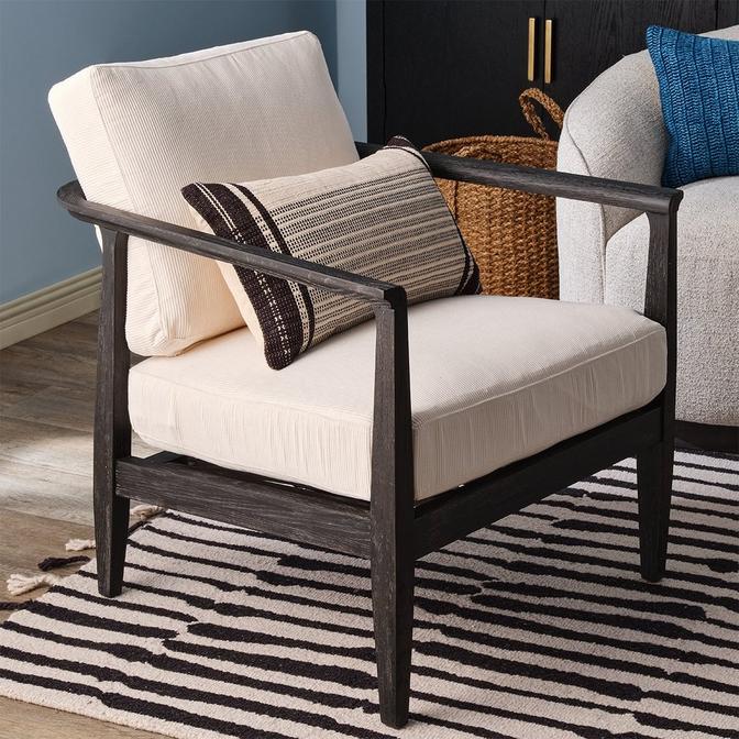 The Seri Accent Chair is a stylish addition to any space, bringing a whole new level of sophistication to your home. The chair features a curved open-back silhouette that is complemented by a dark espresso stain with a light gray glaze, which highlights the natural wood grain. Adding comfort to the piece is a set of removable seat and back cushions, upholstered in a sumptuous channeled white fabric.