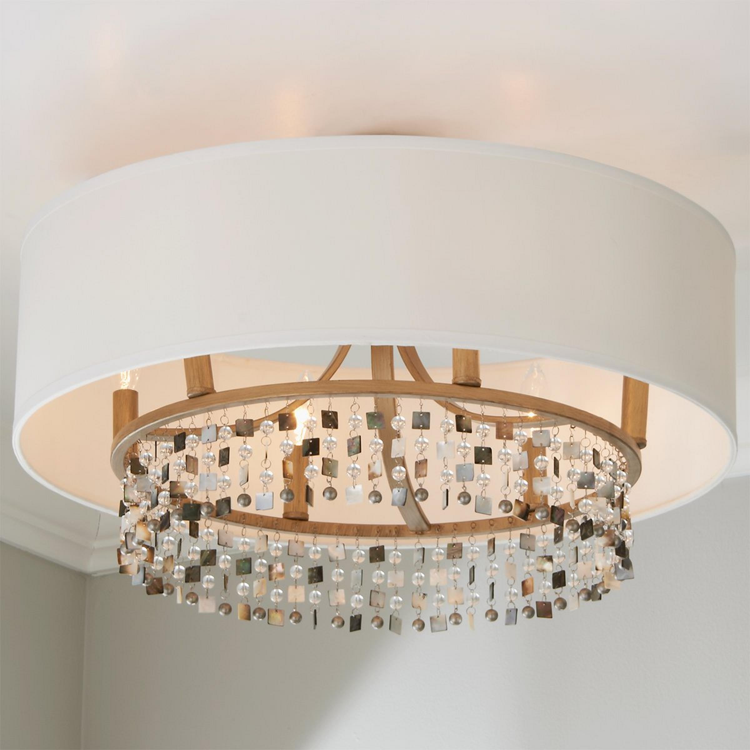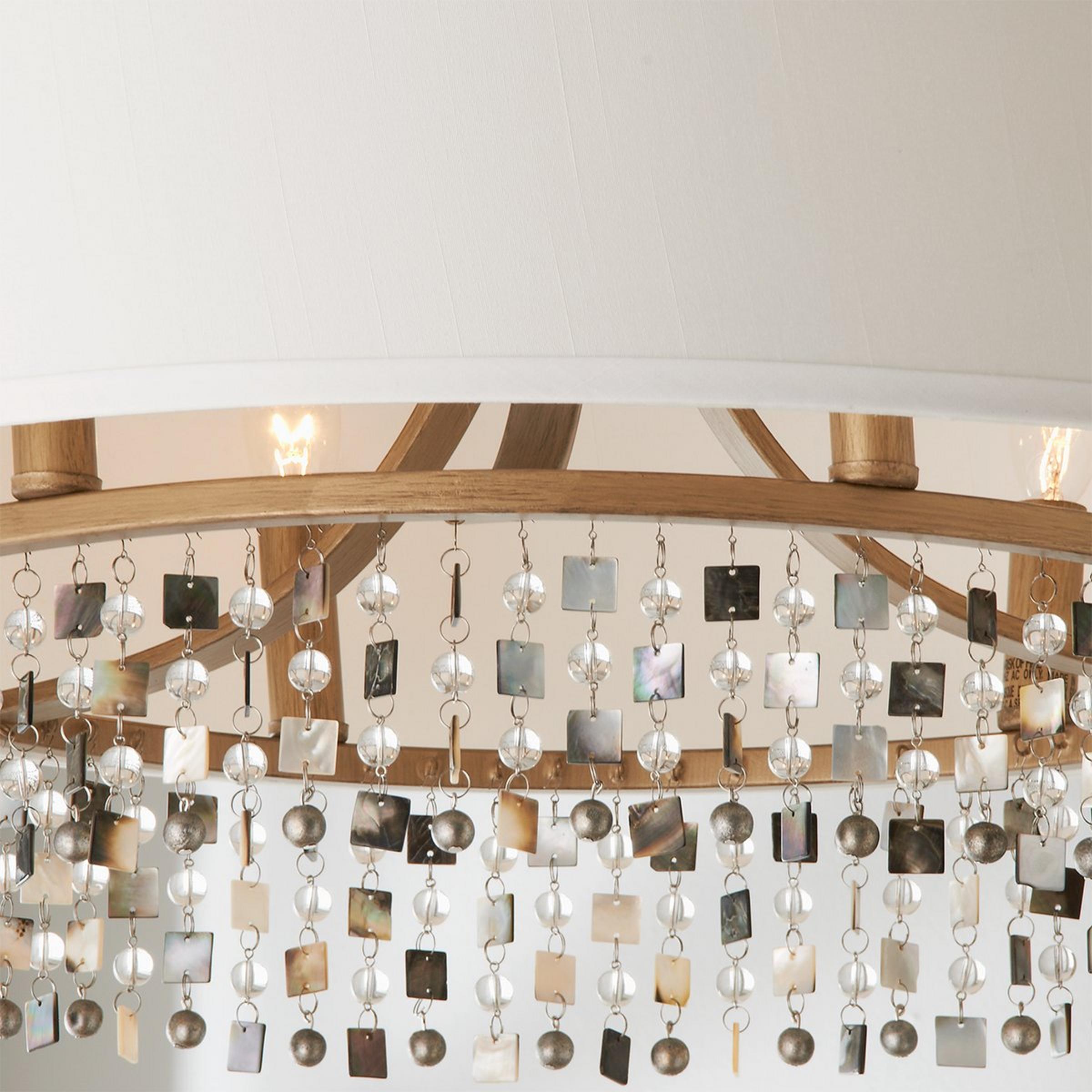 Dress up your coastal cottage dining room with clean modern style! This 6 light drum shade chandelier has a gold frame that suspends a curtain of mother of pearl shell shapes and crystals. Convertible mount allows for installation as a semi-flush mount or hanging fixture.