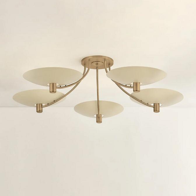 The Skyline Ceiling Light provides a delicate glow to fill a room by bouncing light upwards off a ceiling rather than shining a spotlight down over the space. A trio of disks carry the formality of a chandelier while remaining close to the ceiling to fit into rooms of any size.
