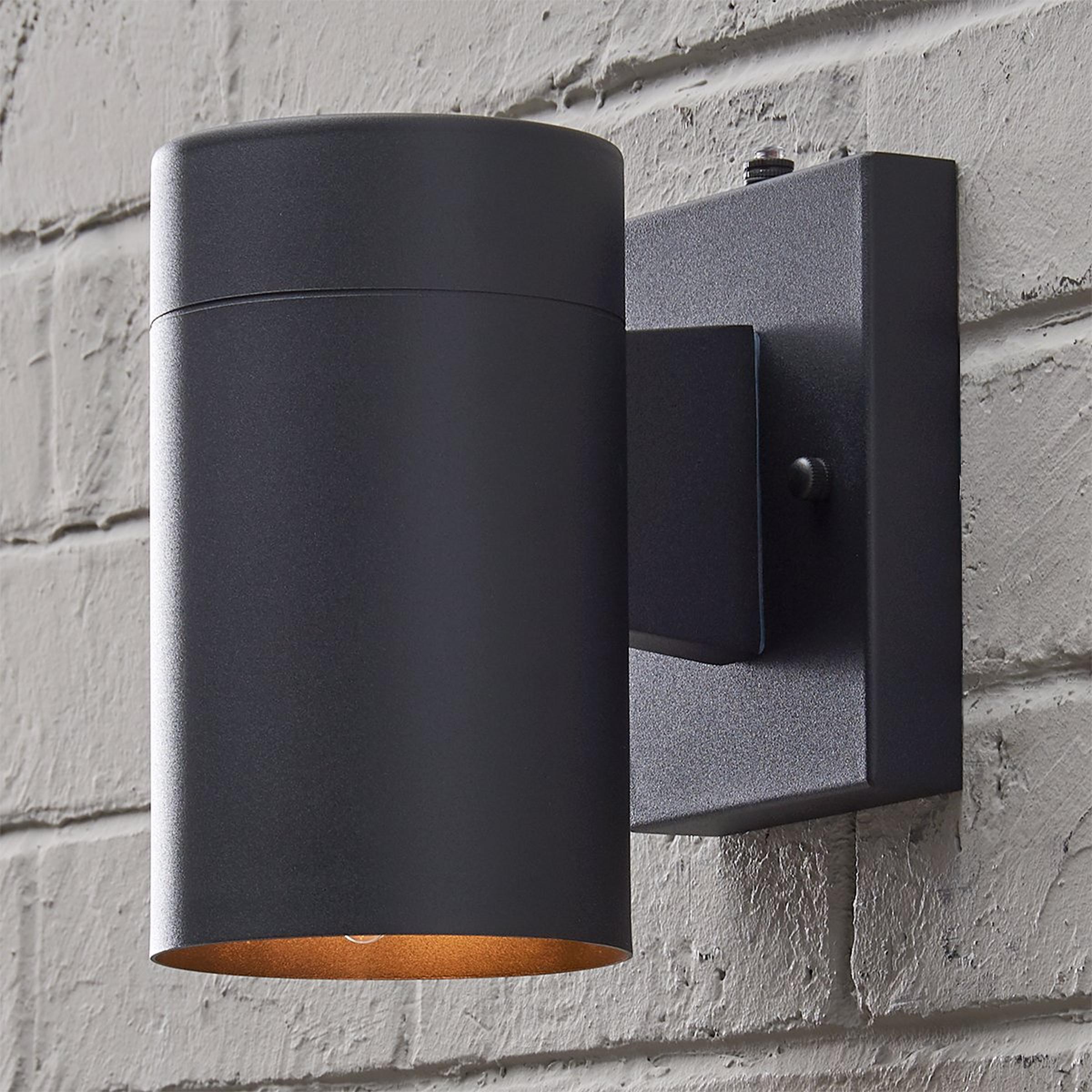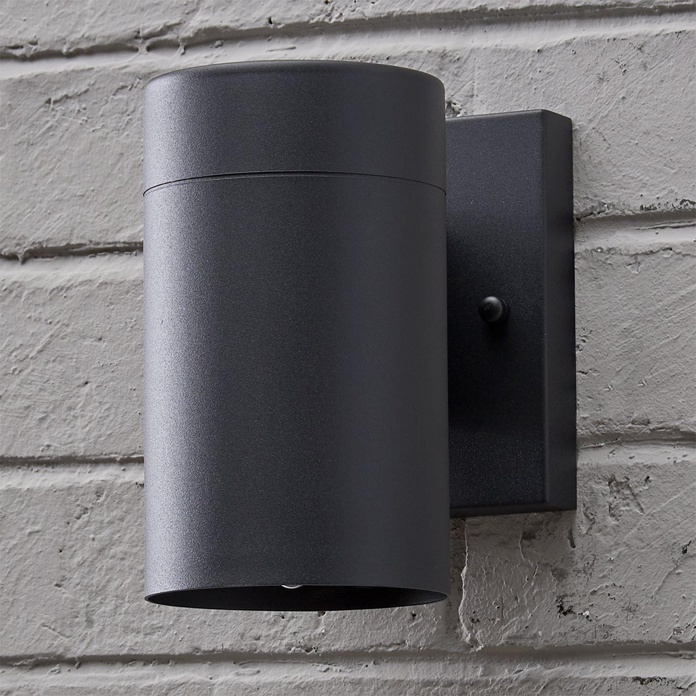 Sleek modern minimalism reigns in this trendy modern cylinder indoor-outdoor wall sconce. The simple cylindrical body contrasts with the rectangular back plate for a bold look that works well in modern farmhouse outdoor spaces and indoor room designs. This fixture includes a dusk to dawn photo cell switch, to provide efficient illumination to your front door, porch, patio or other outdoor area.