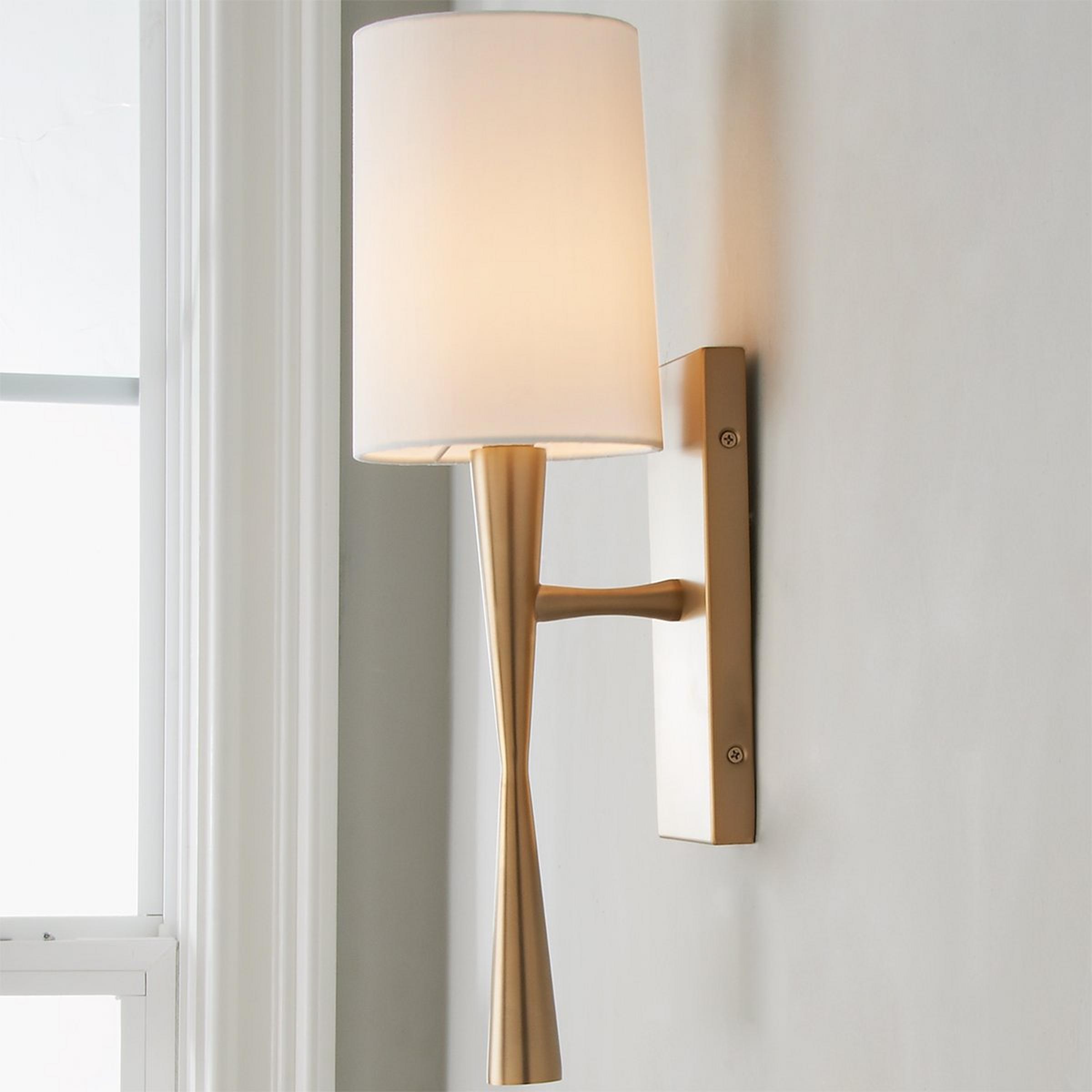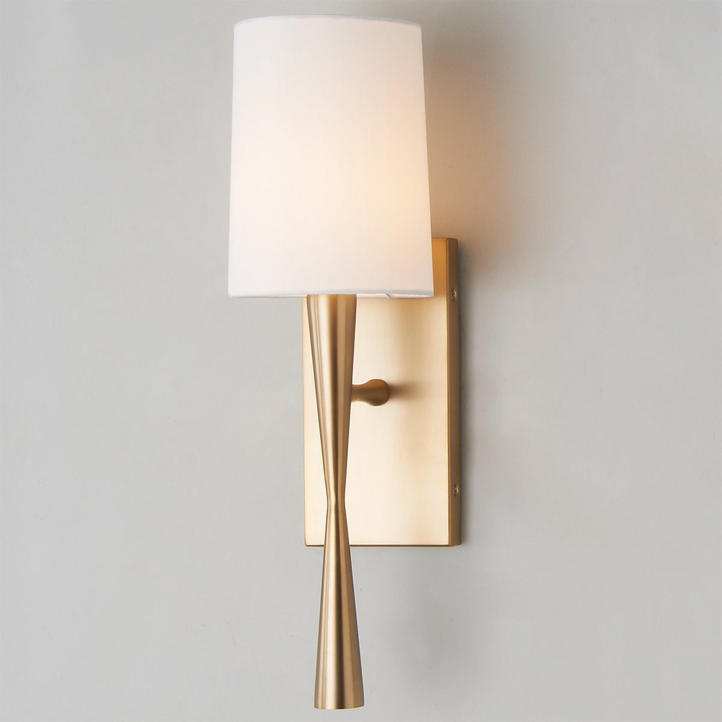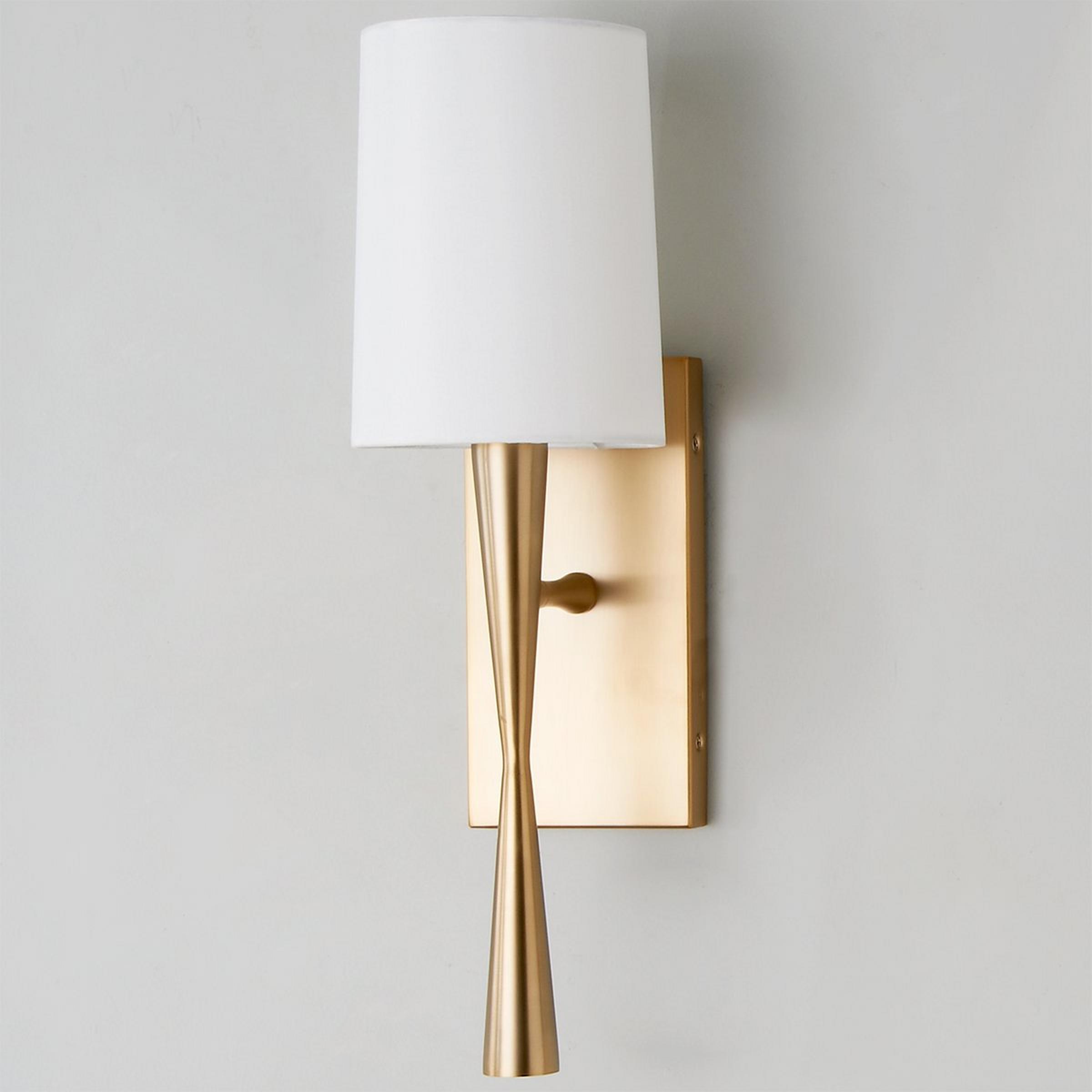 This smooth modern sconce brings bold, sleek shapes to stylish spaces. A slick hourglass body mounted on a rectangular backplate is the focus of this bold fixture. The White cylinder shade softens the look for contemporary decor.