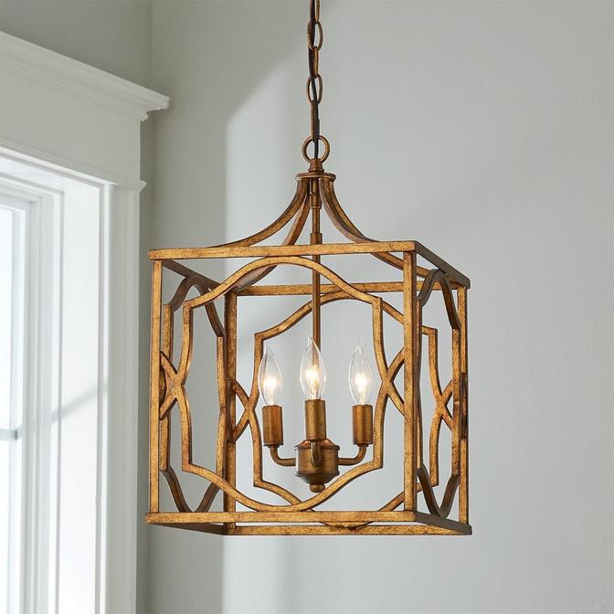 A modern fretwork trellis frame in gold or silver adds Chippendale style from the foyer to the library. Can be installed close to the ceiling or dropped as a lantern.