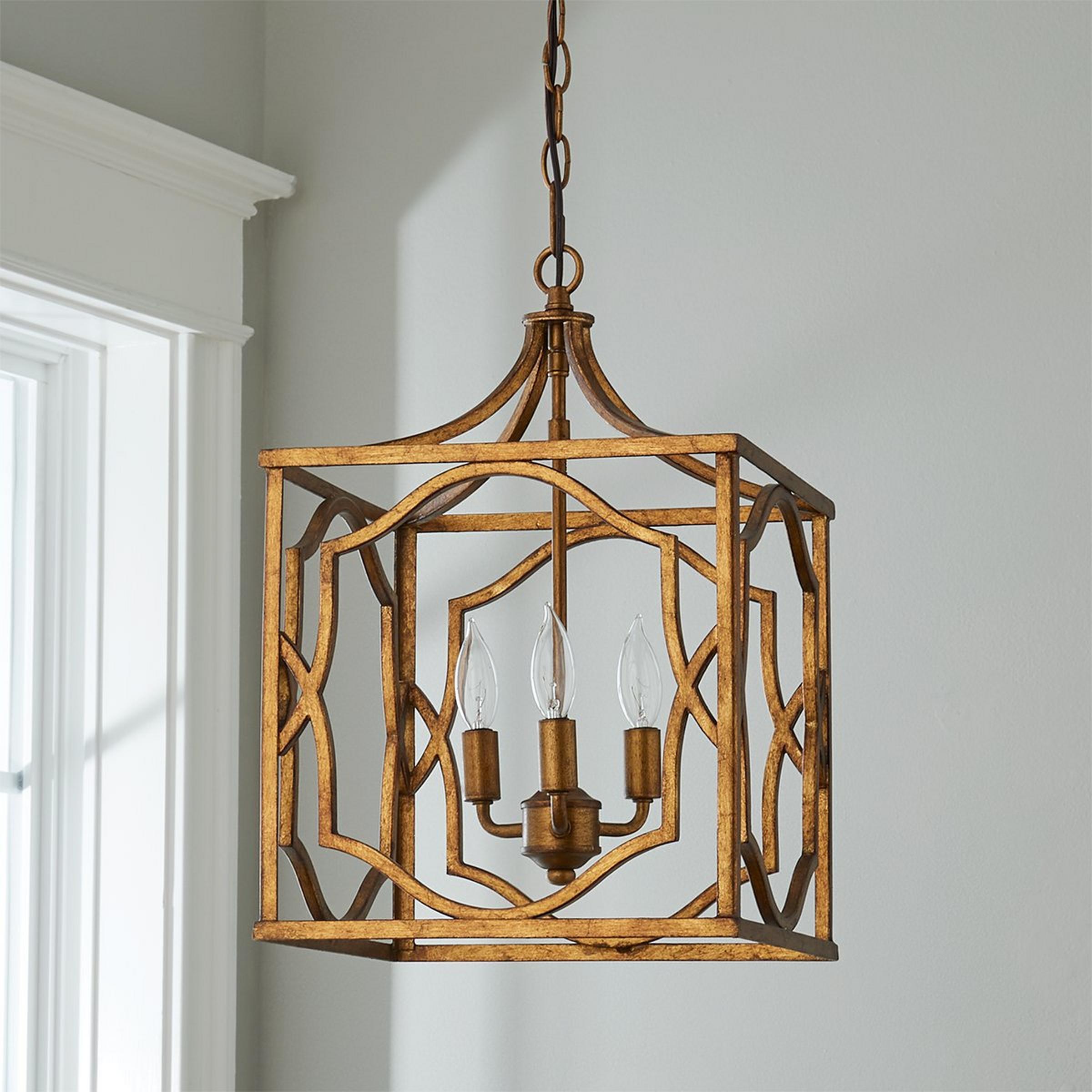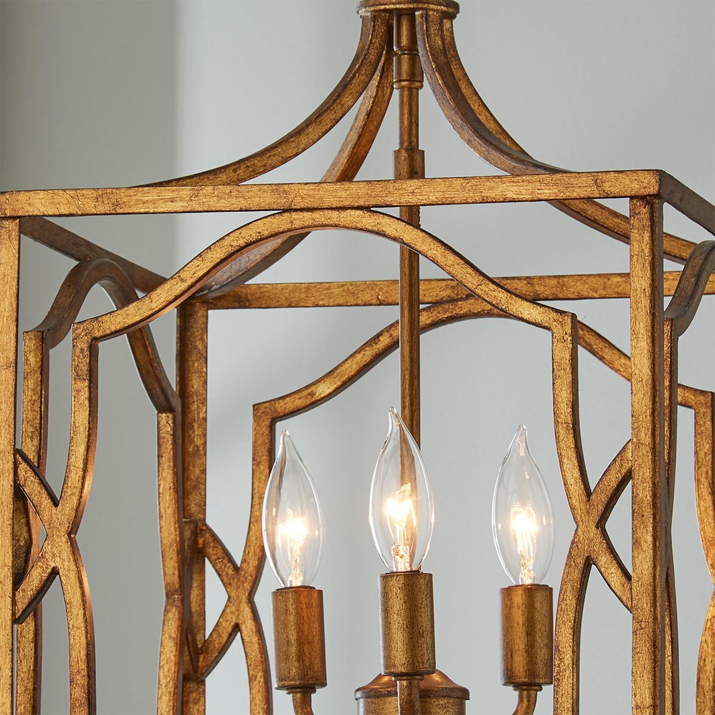 A modern fretwork trellis frame in gold or silver adds Chippendale style from the foyer to the library. Can be installed close to the ceiling or dropped as a lantern.