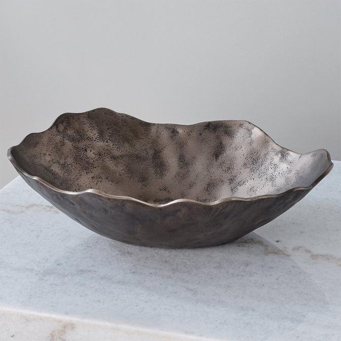 The Smelter Bowl is a real celebration of the craft of sand casting and aluminum metalwork. The rough texture along with the wavy edge and oblong shape give an organic really freeform look to this bowl. Perfect for using to bring some texture and warmth to any space, with it’s warm golden toned bronze finish. In addition to being a centerpiece bowl, this also has hardware integrated in the bottom so that it can be hung on a wall as an interesting wall accent. On top of all of this versatility, it is also able to be used outdoor so it can even serve as a wonderful accent on your outdoor dining table or coffee table.