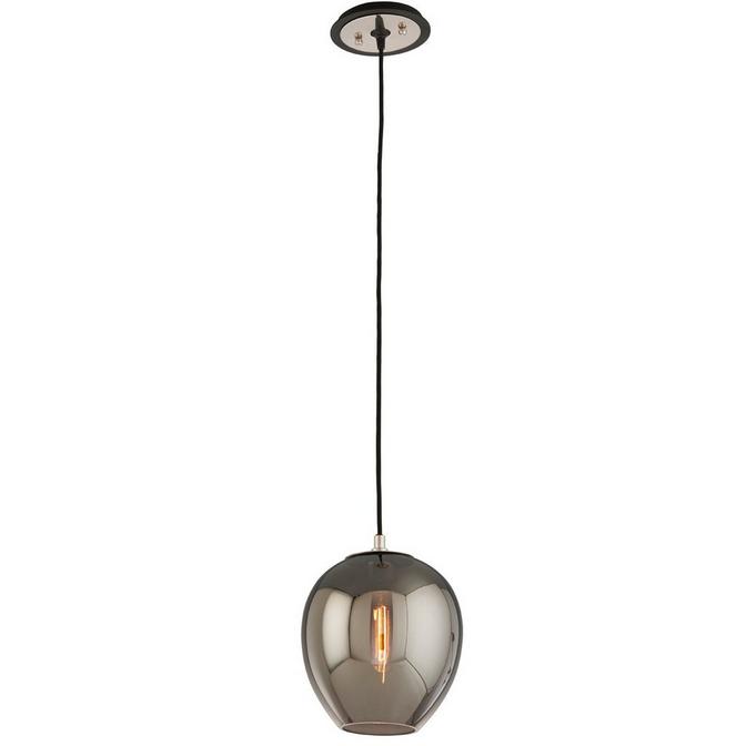 A glass globe in a modern smoked finish hangs from matte black cloth cord and a polished nickel canopy to create this sleek pendant.