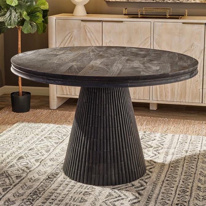 Discover our Sochare Dining Table, a striking piece of rustic modern design. Its round shape features a sculpted cone-shaped base and a hand-laid, chiseled motif, adding texture and elegance. Comfortably seating four, each table boasts a unique finish from natural materials, ensuring no two pieces are alike.