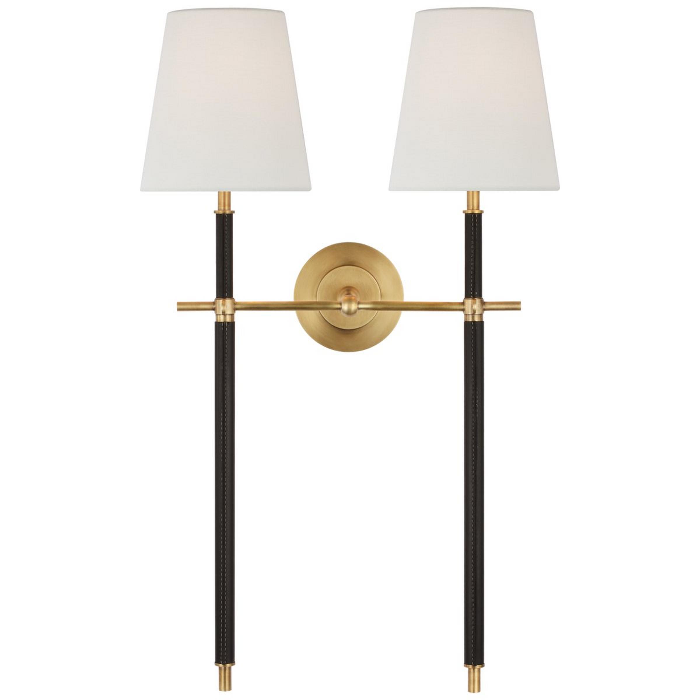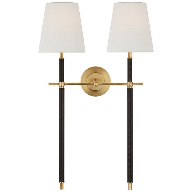 Incorporate urban style into your living space with this uniquely elegant 2-light cast brass sconce. This chic minimalist sconce comes with linen shades and stunning leather accents. This light is available in multiple finishes. This metal sconce is not lacquered, so the fixture will age gracefully with time.