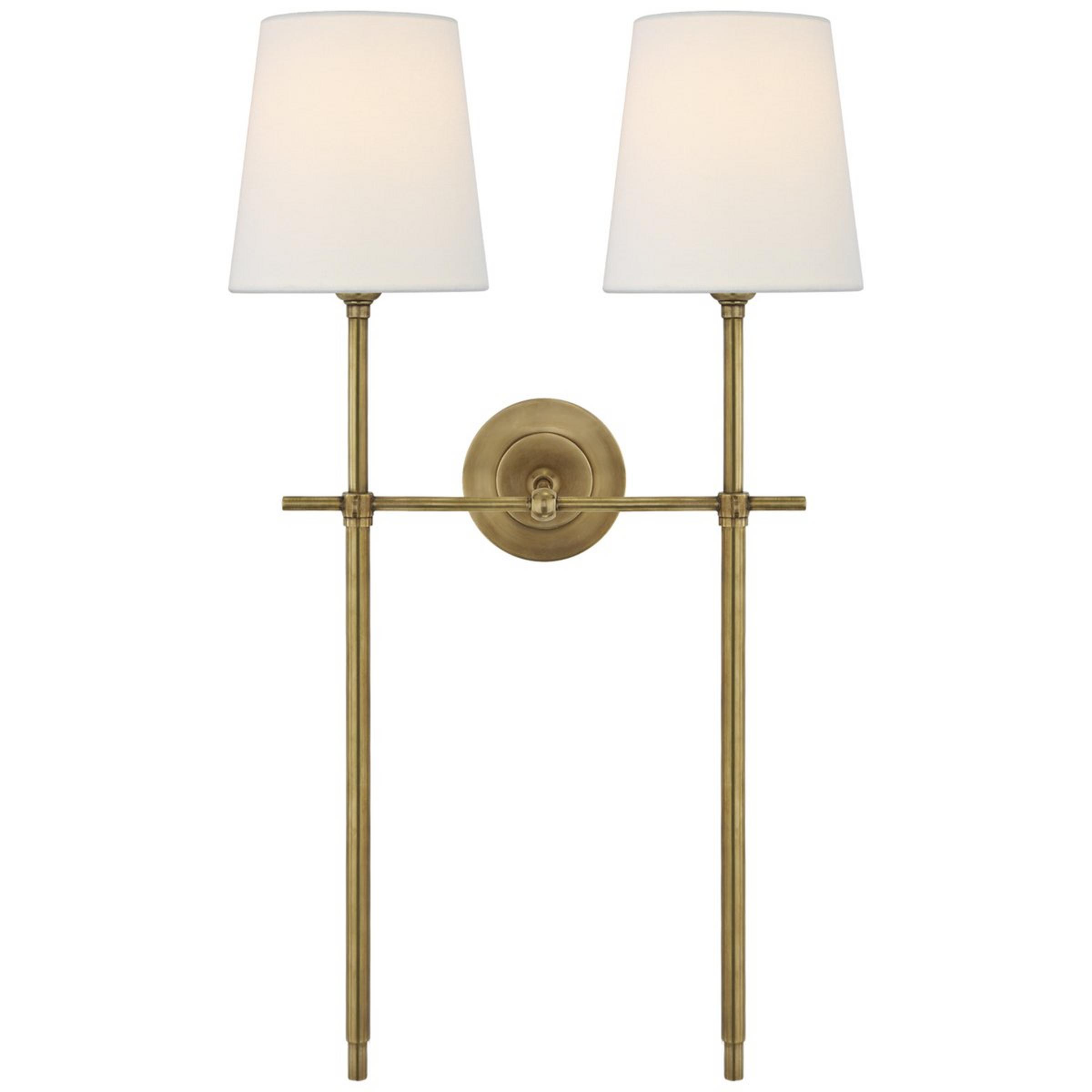 Incorporate urban style into your living space with this uniquely elegant 2-light cast brass sconce. This chic minimalist sconce comes with a linen shade and is available in multiple finishes. This metal sconce is not lacquered, so the fixture will age gracefully with time.