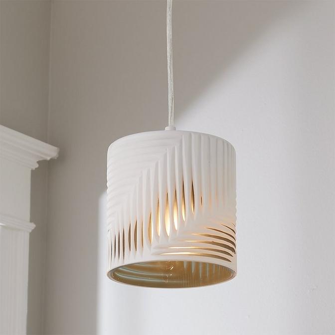 Thick art glass is cut in a pattern to let stripes of light peek through the glass in this modern, yet warm pendant, perfect for over a kitchen island. This pendant is assembled by hand in our Richmond, Virginia production facility. Due to the nature of this art glass no two will be exactly alike in pattern or shape.