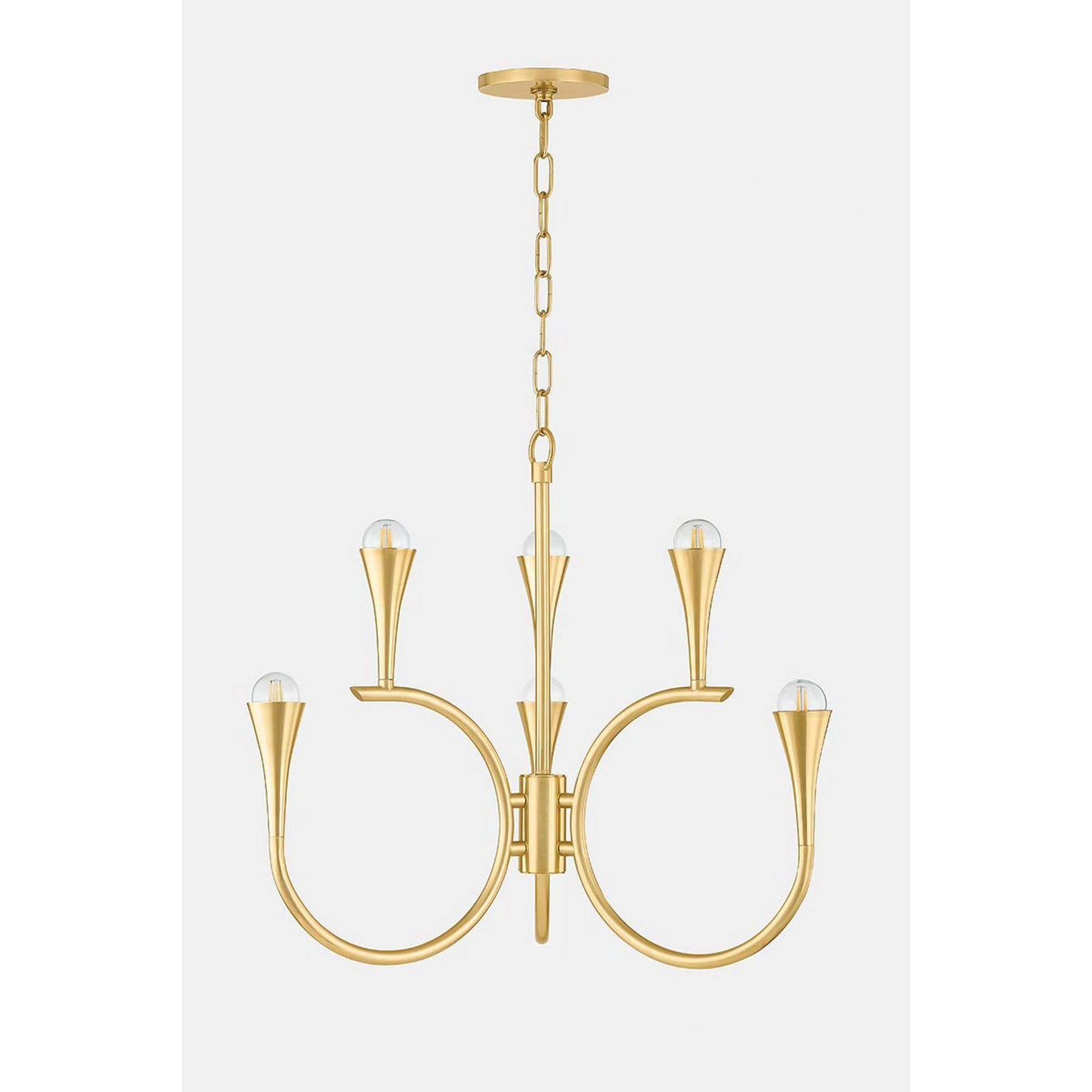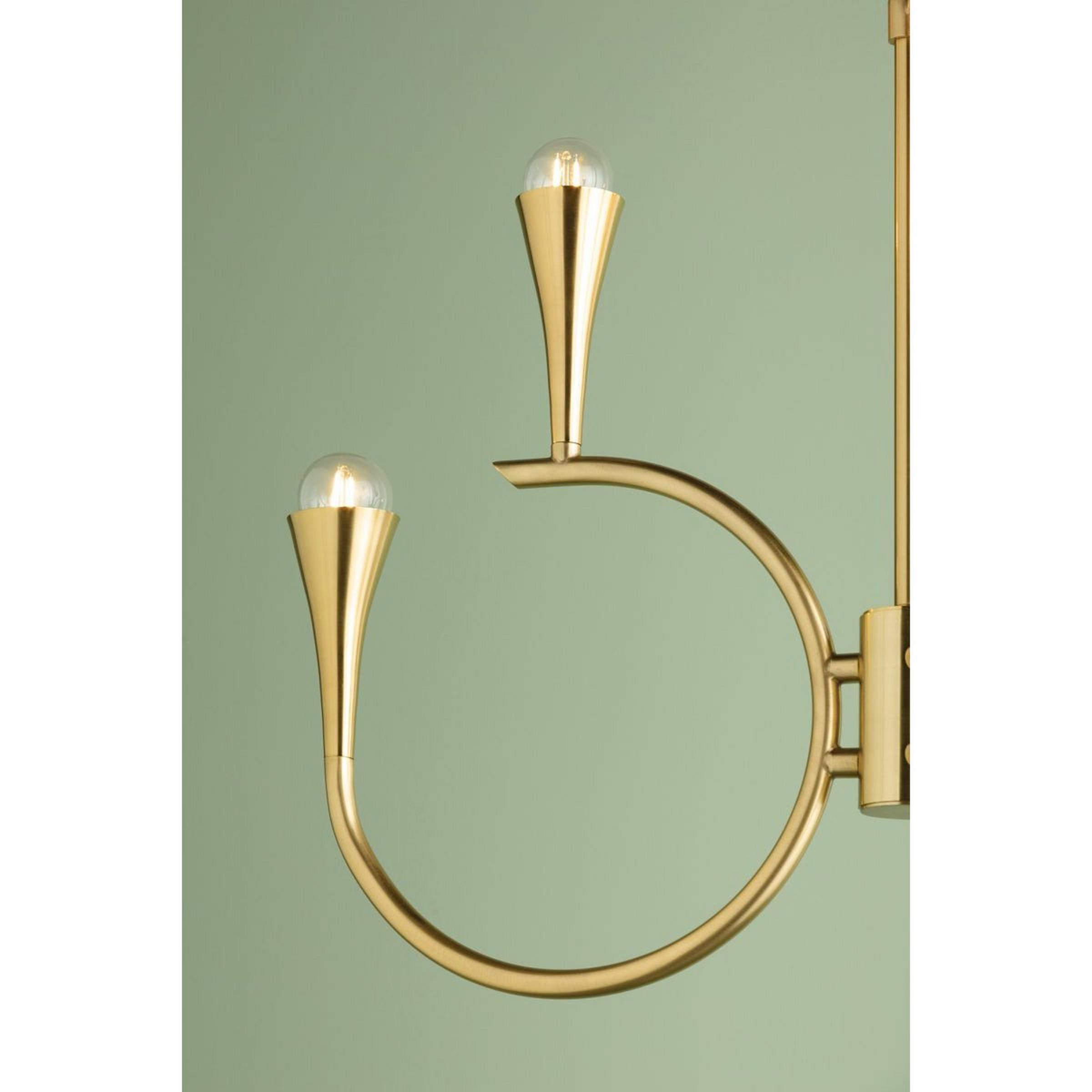 The Sommerset Chandelier features sophisticated curving rods that hold dazzling tapered candlesticks. The design is abstracted yet evocative of majestic deer antlers, hooped jewelry, or orchestral brass instruments.