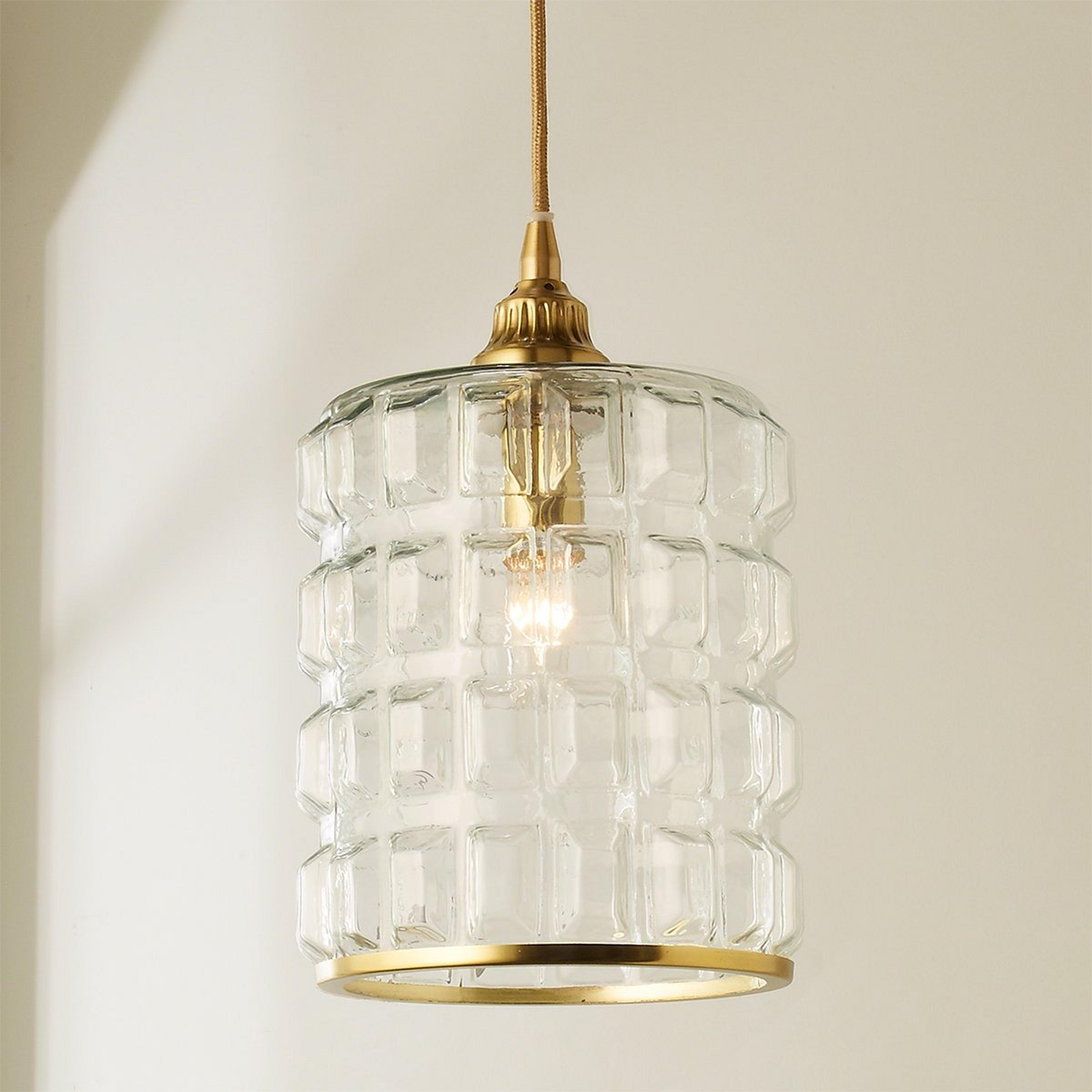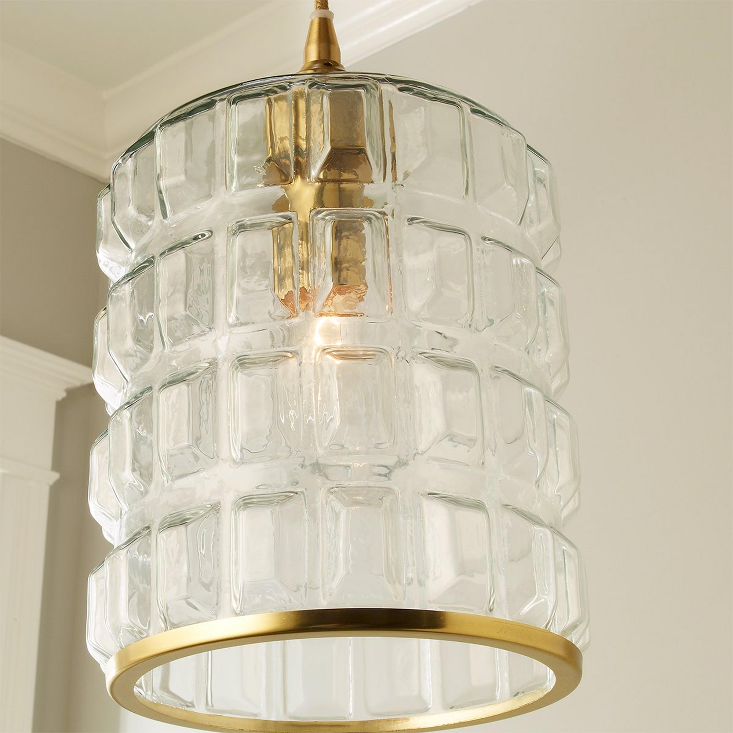 The molded square geometric shapes on this modern glass pendant give it a retro vibe. The lip of the pendant has a metal trim providing an elegant and sophisticated detail.