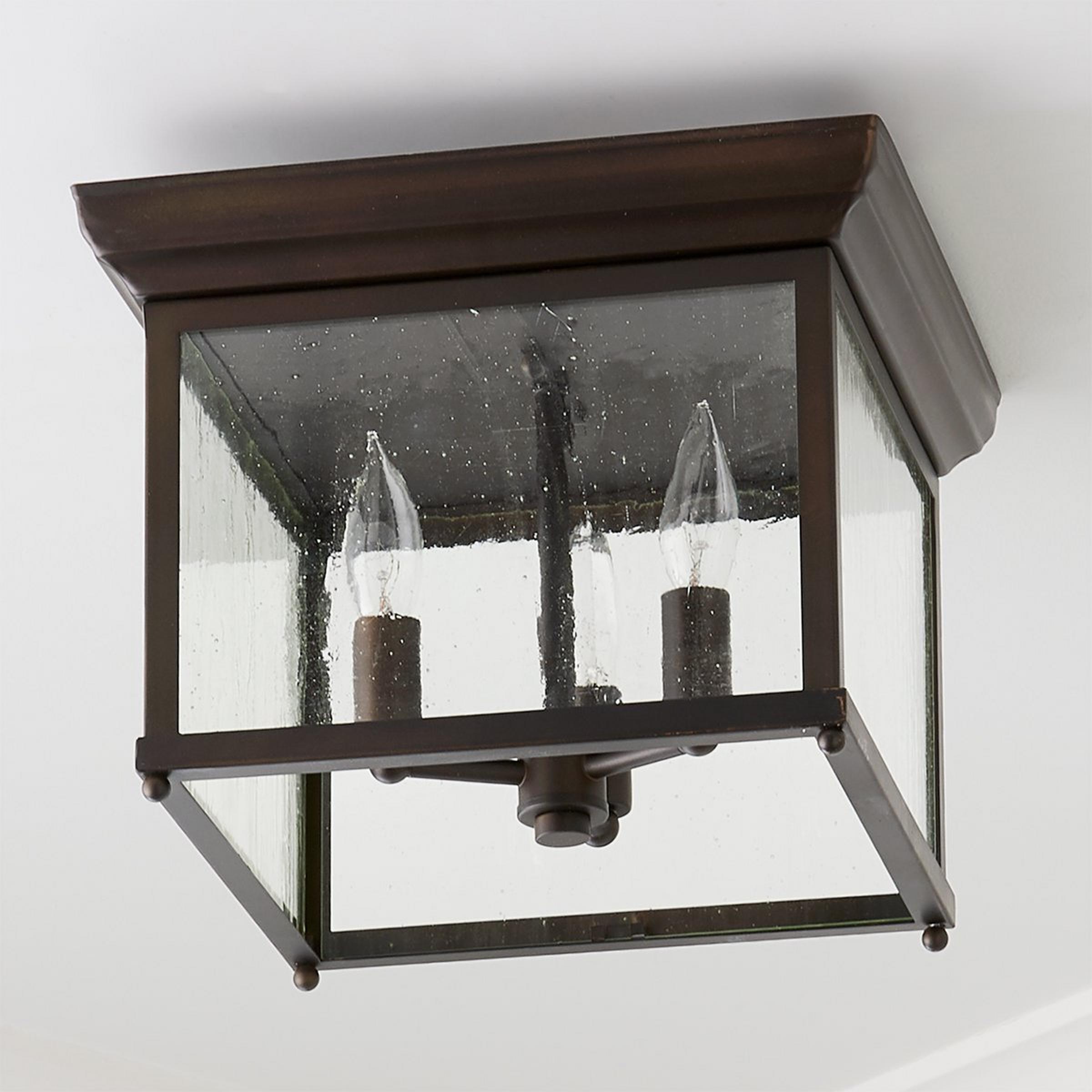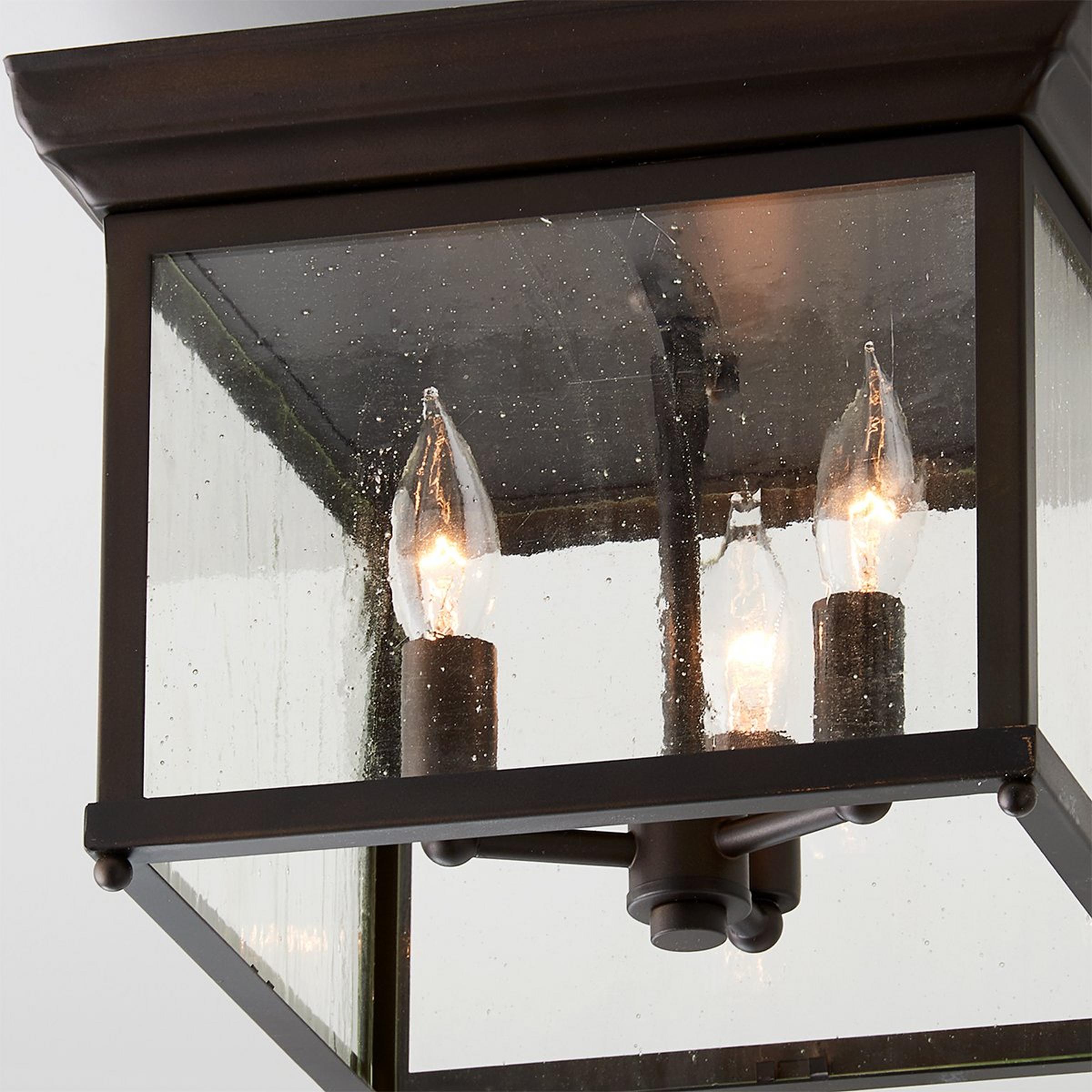 Keep it fair and square with this simplistic design! Indoors or out, this 3 light cluster ceiling light has a rustic chic. Antique glass.