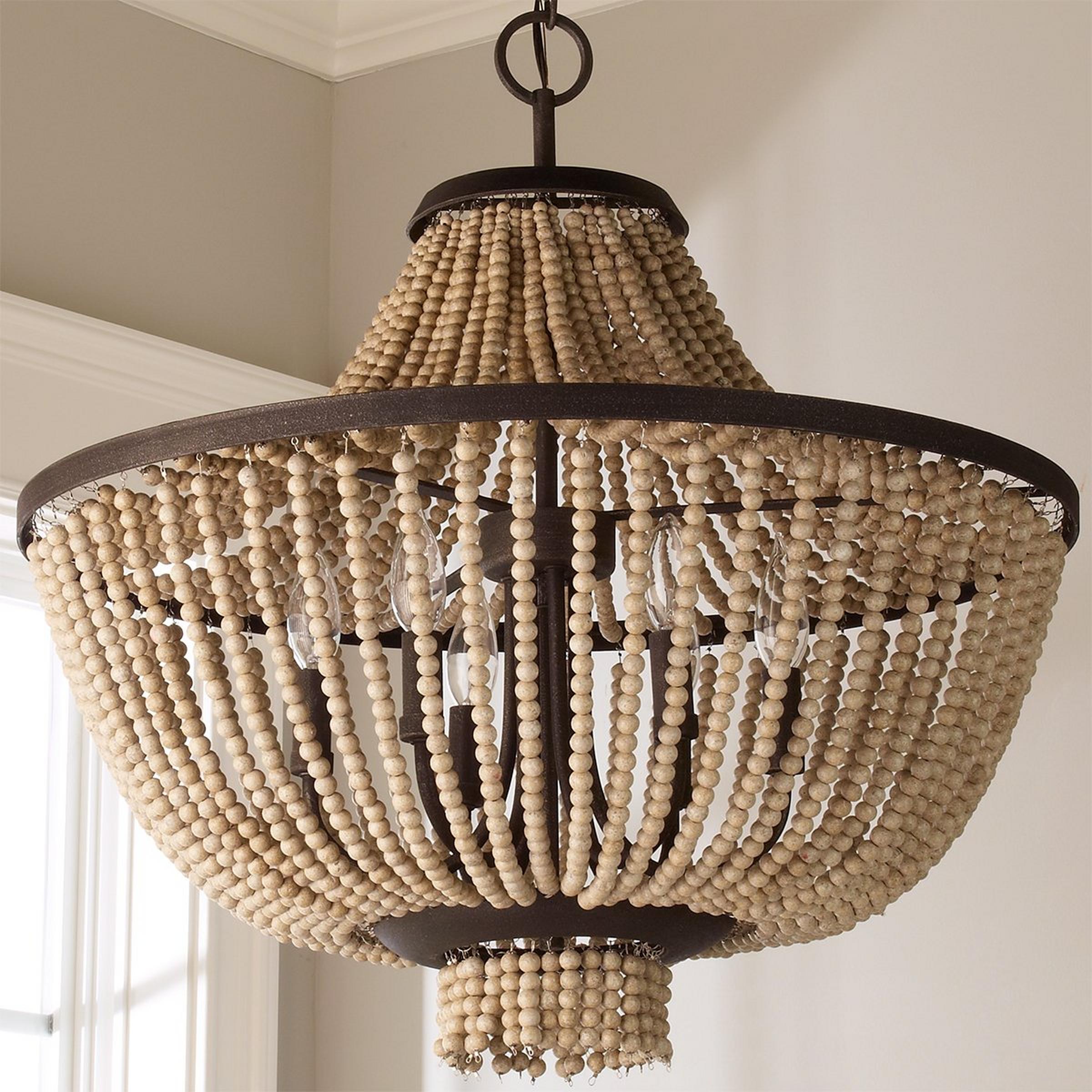 This rustic chandelier offers a refreshing twist on a classic shape with a wide, squat body featuring distressed antique white wood beads draped elegantly from a distressed black ring frame.