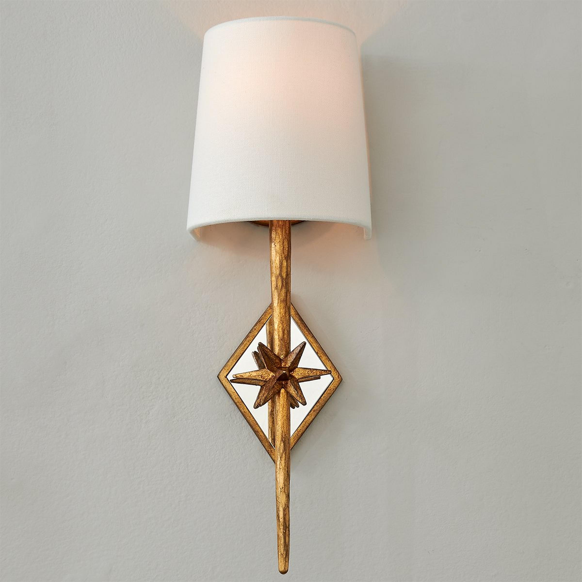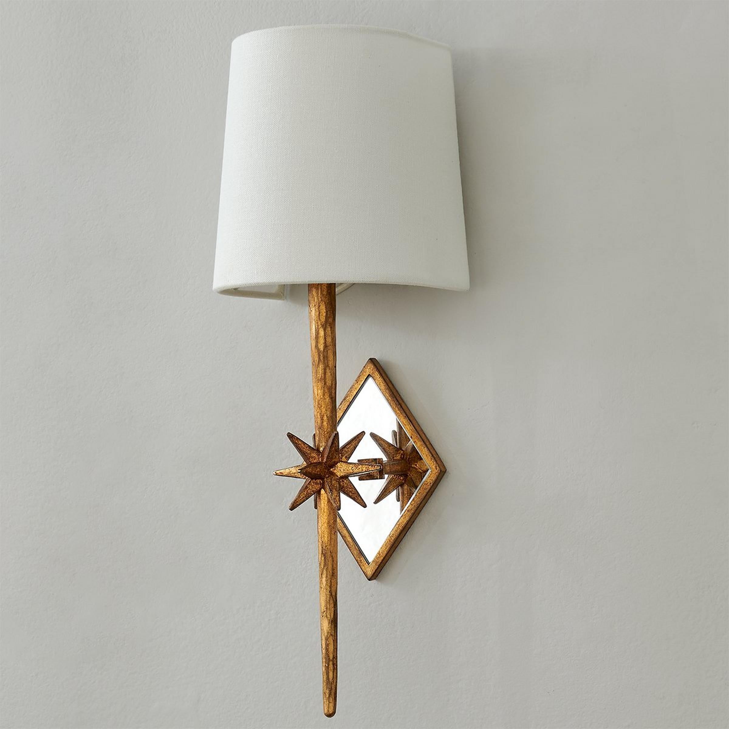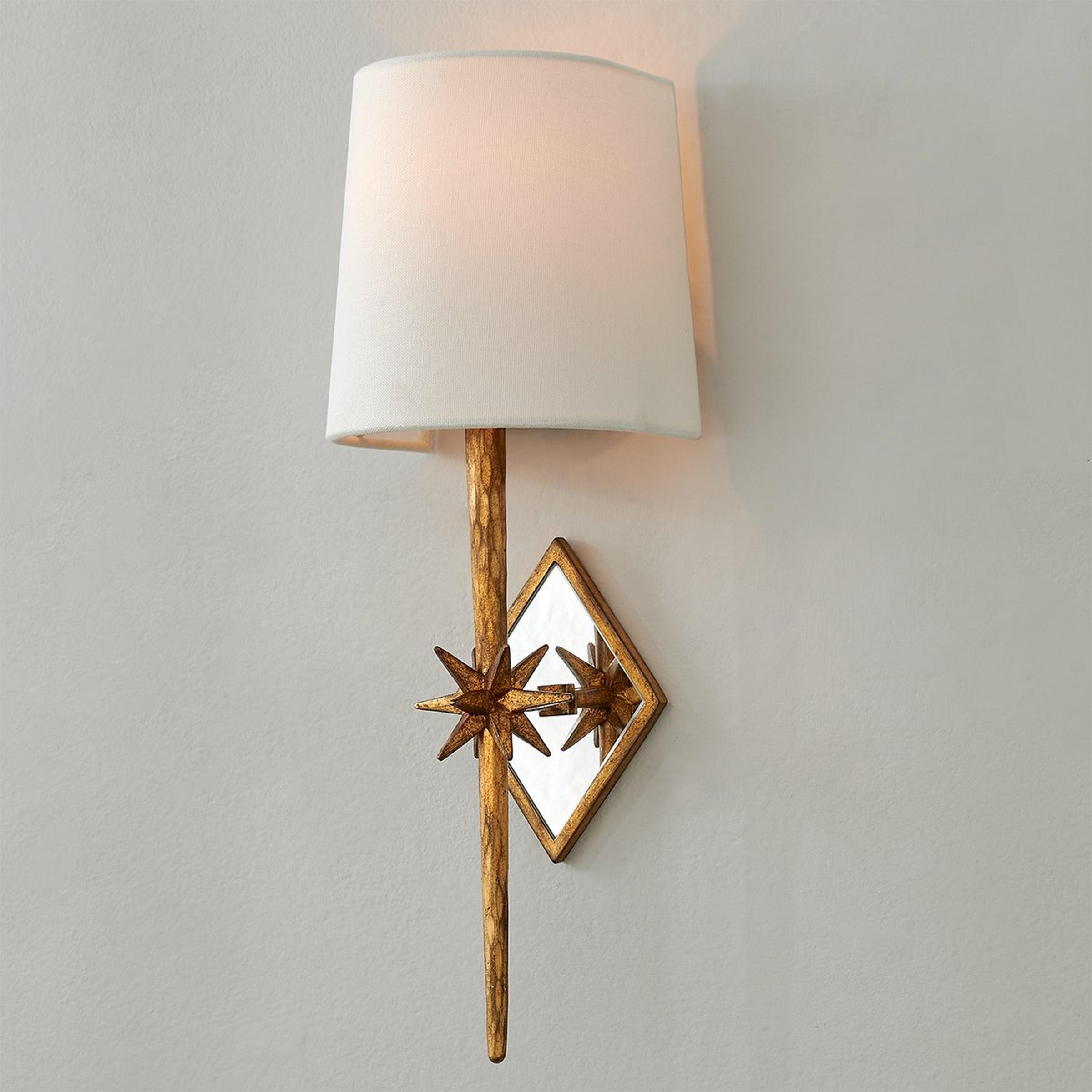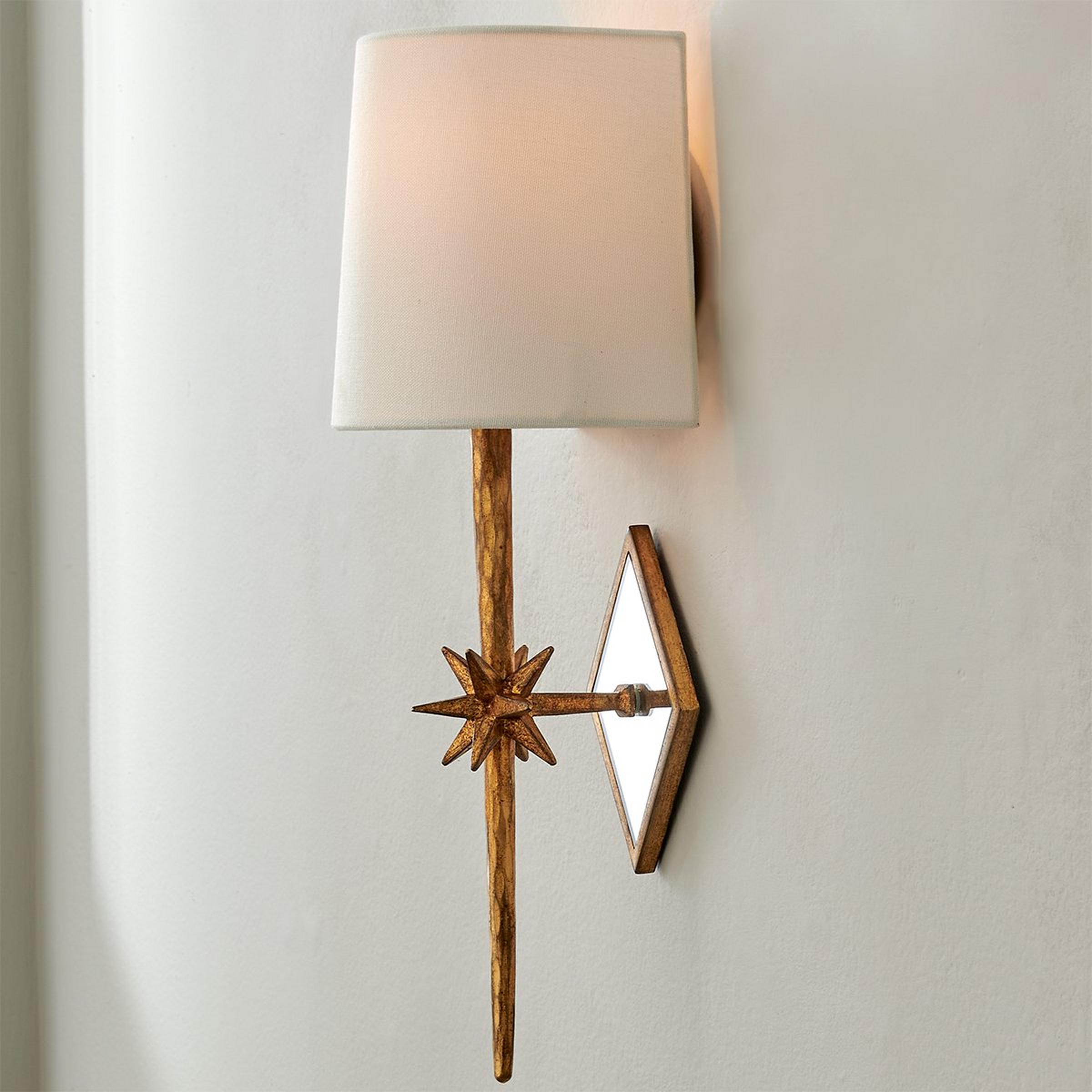 A diamond shaped mirrored wall plate magnifies the impact of this starburst 1 light sconce. With a linen half shade (included), it can be the star beside powder room mirrors or over dining buffets. 60 watts candle socket. (16.5"Hx5.5"Wx5.5"D) Shade: 4.5"x5.5"x6.5" Backplate" 4.5" diamond