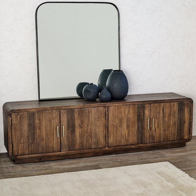 The Steinbeck media console anchors the room with its sculptural silhouette and quiet sophistication. Crafted from dark-stained hardwood with a vertically brushed texture, each of its four doors reveals generous interior storage with four adjustable interior shelves. Sleek metal pulls in a muted brass finish lend a subtle gleam maintaining a seamless façade. Rounded corners soften the rectilinear form, making it equally suited for a plethora of interior styles. Ideal as a dining room credenza, media console, or entryway statement piece.