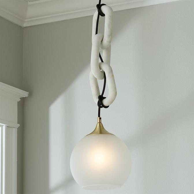 Carved marble links casually strung together with cloth lamp cord make this globe pendant stand out from the crowd. Perfect over a kitchen island or in a modern dining room this pendant will be a show stopper. This pendant is assembled by hand in our Richmond, Virginia production facility.