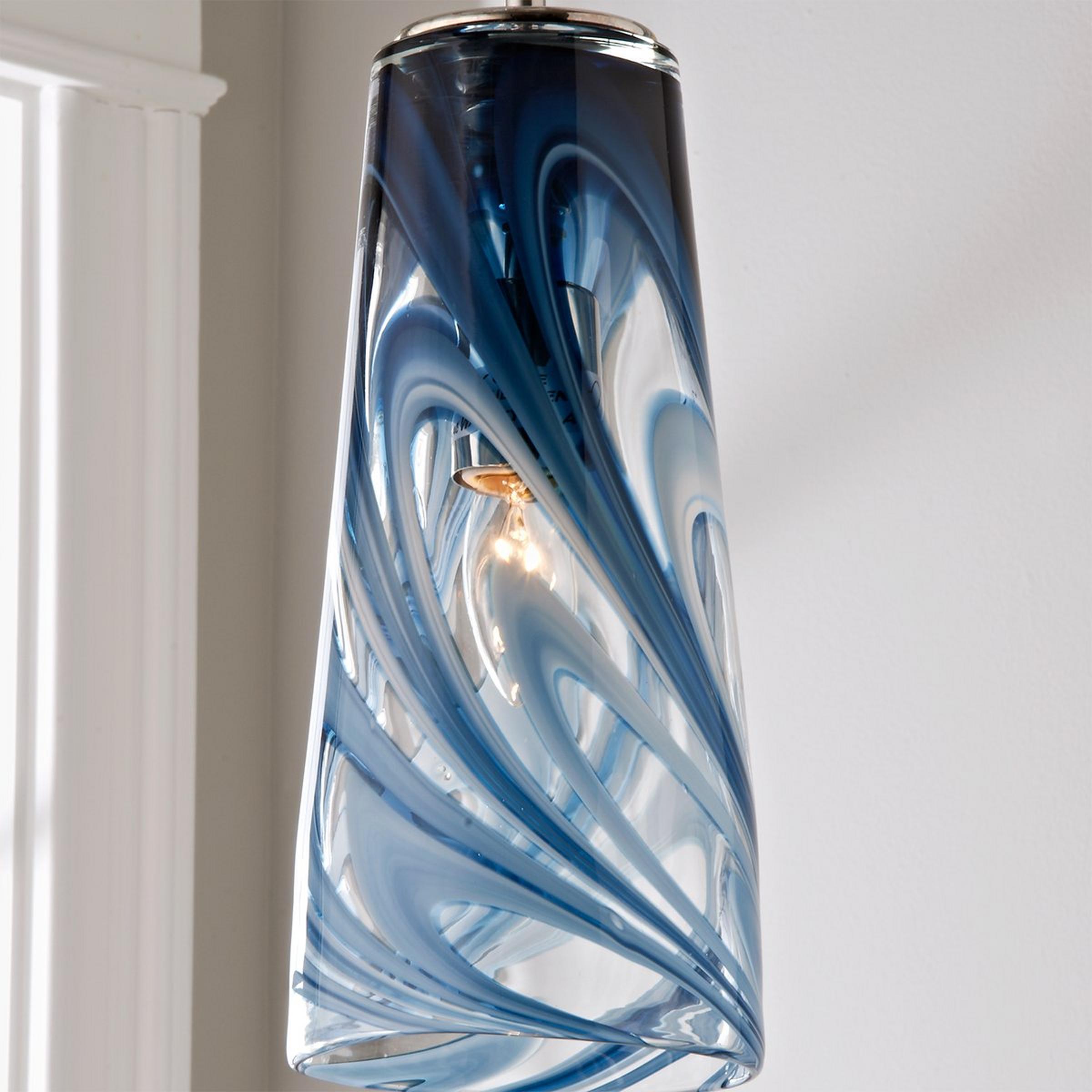 Hand blown blue art glass, reminiscent of the sky before a storm, surrounds this tapered pendant light. This one-of-a-kind fixture is a great way to bring an organic element to any modern, transitional, or coastal space. Because of the nature of art glass, variations in color, pattern, bubbles and texture should be expected and celebrated; no two art glass pieces are exactly alike.