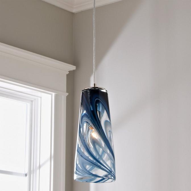 Hand blown blue art glass, reminiscent of the sky before a storm, surrounds this tapered pendant light. This one-of-a-kind fixture is a great way to bring an organic element to any modern, transitional, or coastal space. Because of the nature of art glass, variations in color, pattern, bubbles and texture should be expected and celebrated; no two art glass pieces are exactly alike.