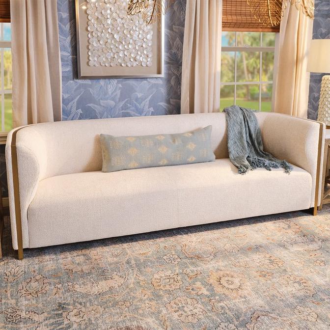 The Swayn Sofa embodies the perfect blend of modern aesthetics and functionality. Its performance fabric, gold stainless steel metal inlay, and elegantly curves emphasize the sofa's graceful silhouette.