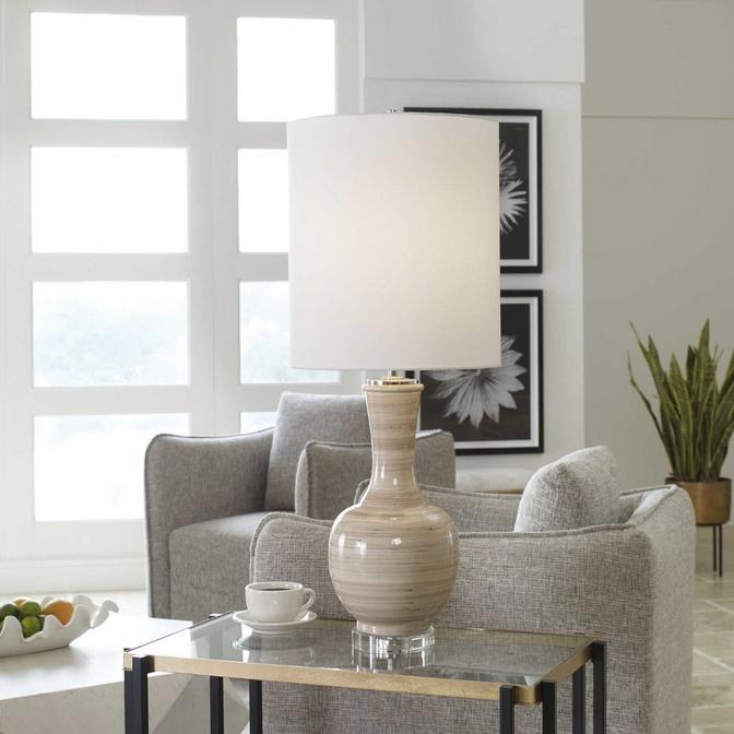 Mimicking windblown desert sands, the body of the Tabernas Table Lamp showcases varying stripes of taupe, tan, and charcoal on top of a crystal base for a neutral look. An elongated white linen shade sits on top for a clean and finished look.