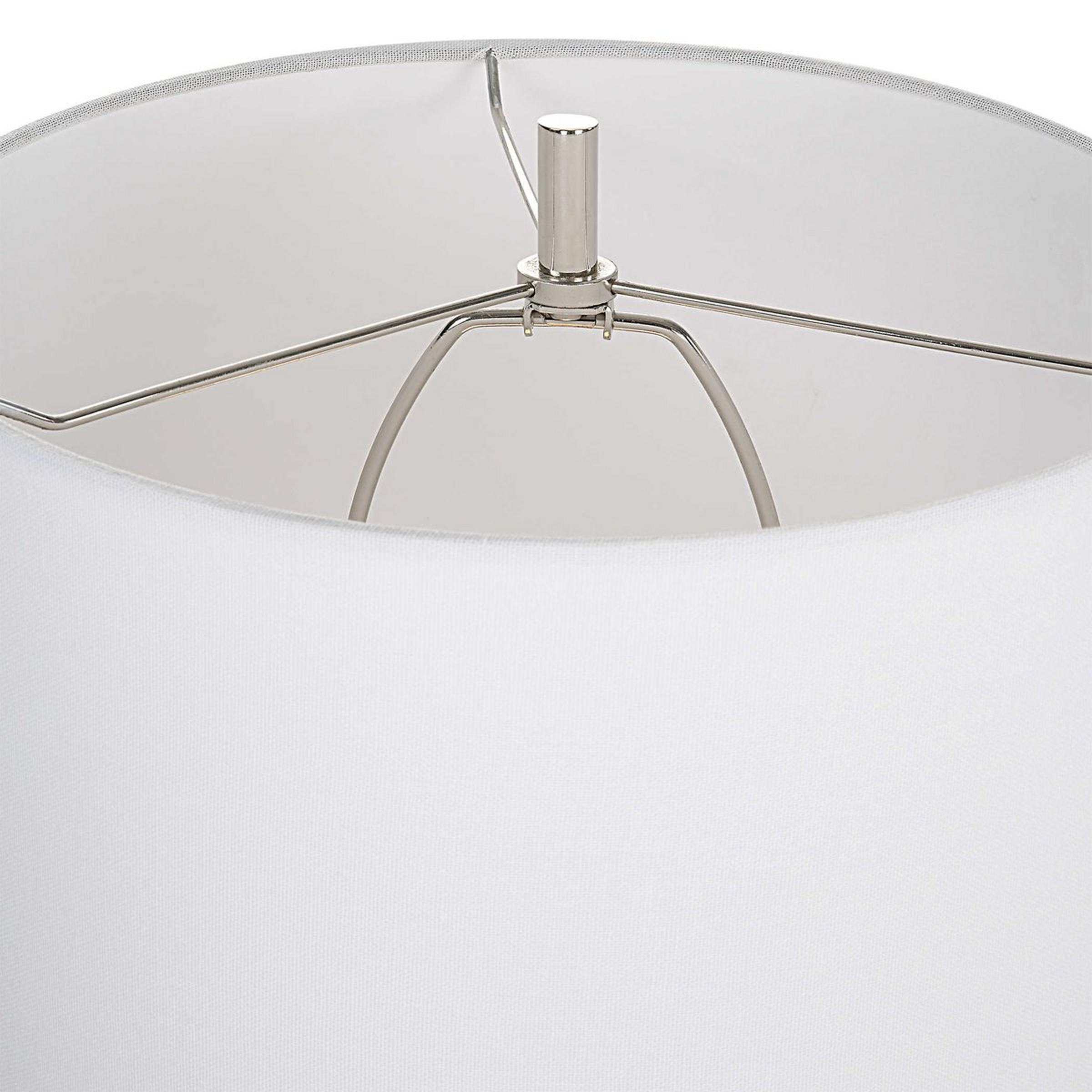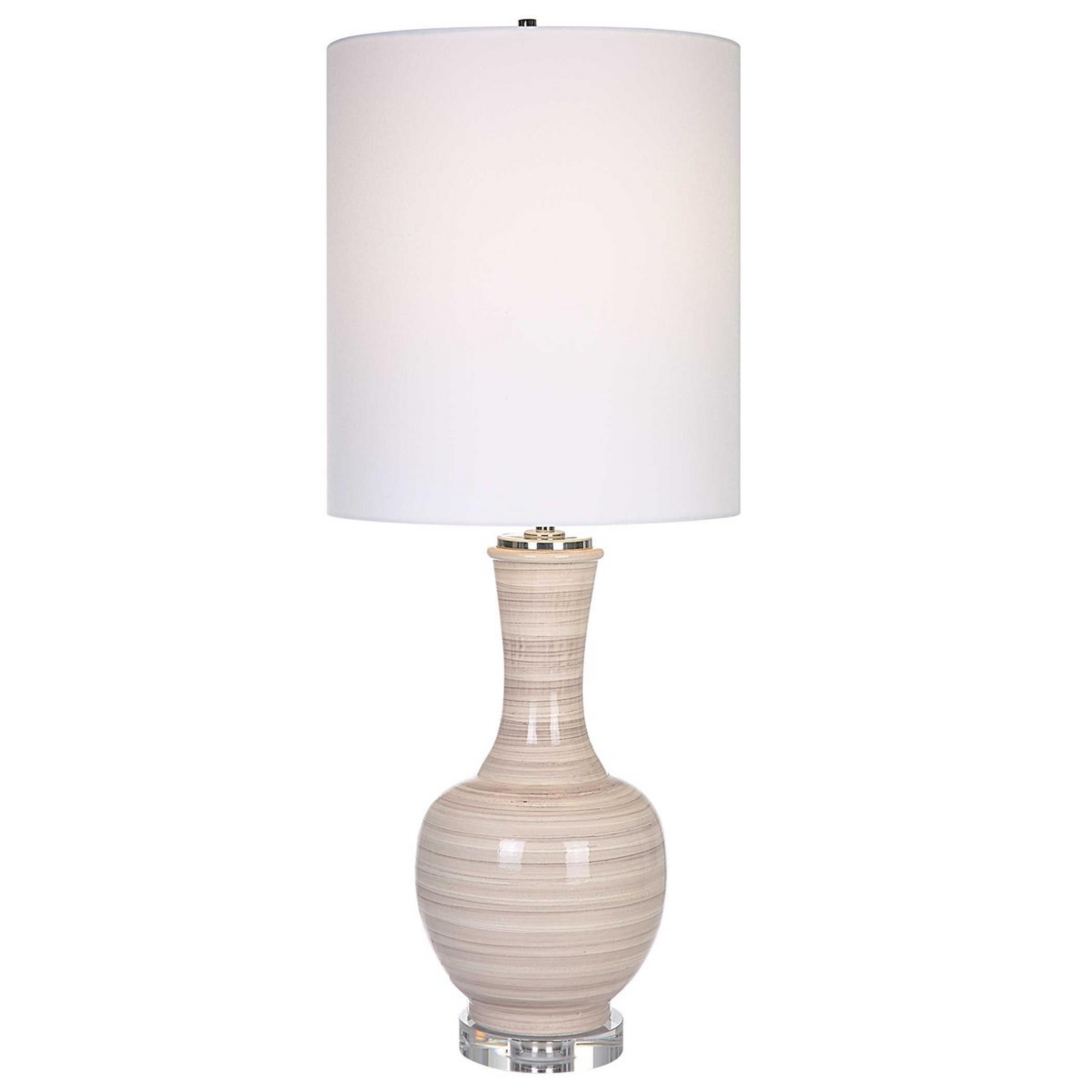 Mimicking windblown desert sands, the body of the Tabernas Table Lamp showcases varying stripes of taupe, tan, and charcoal on top of a crystal base for a neutral look. An elongated white linen shade sits on top for a clean and finished look.