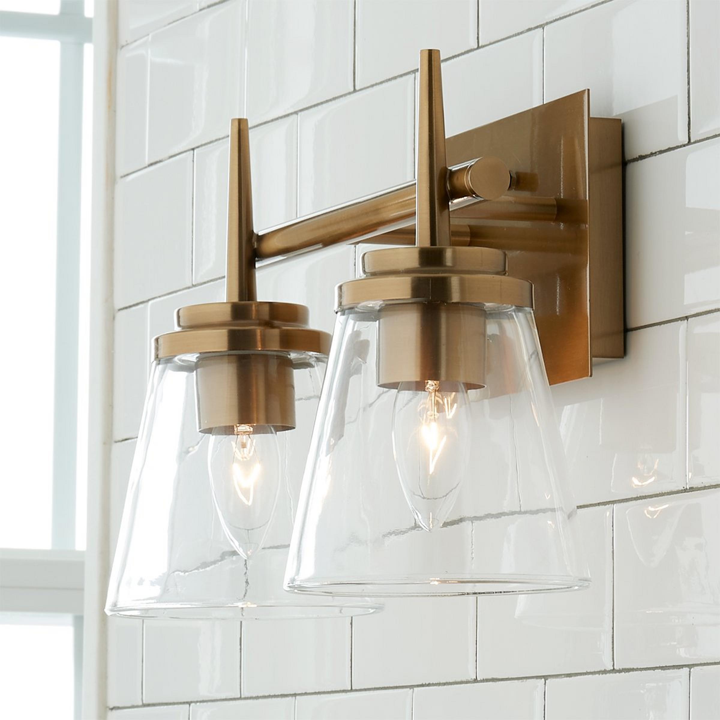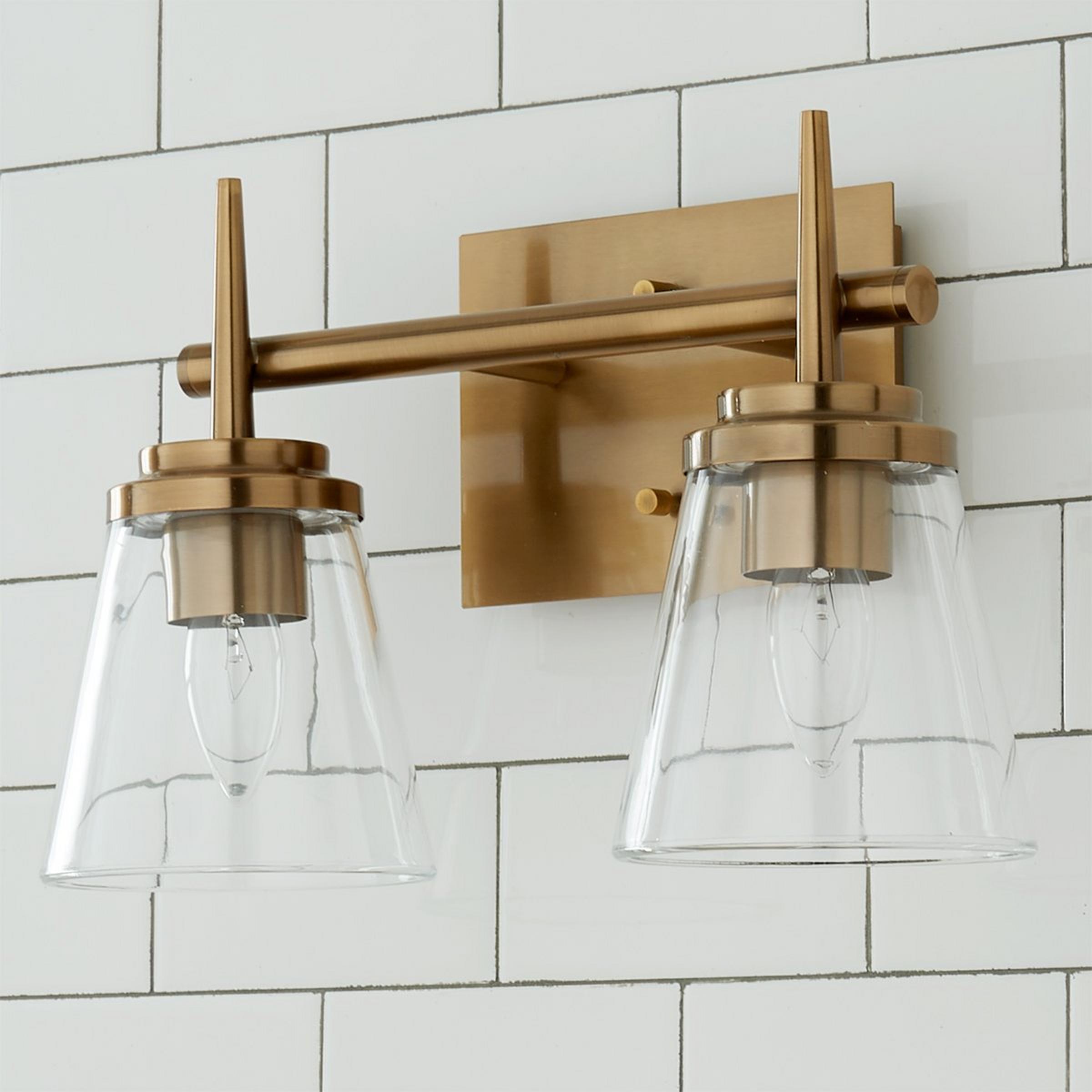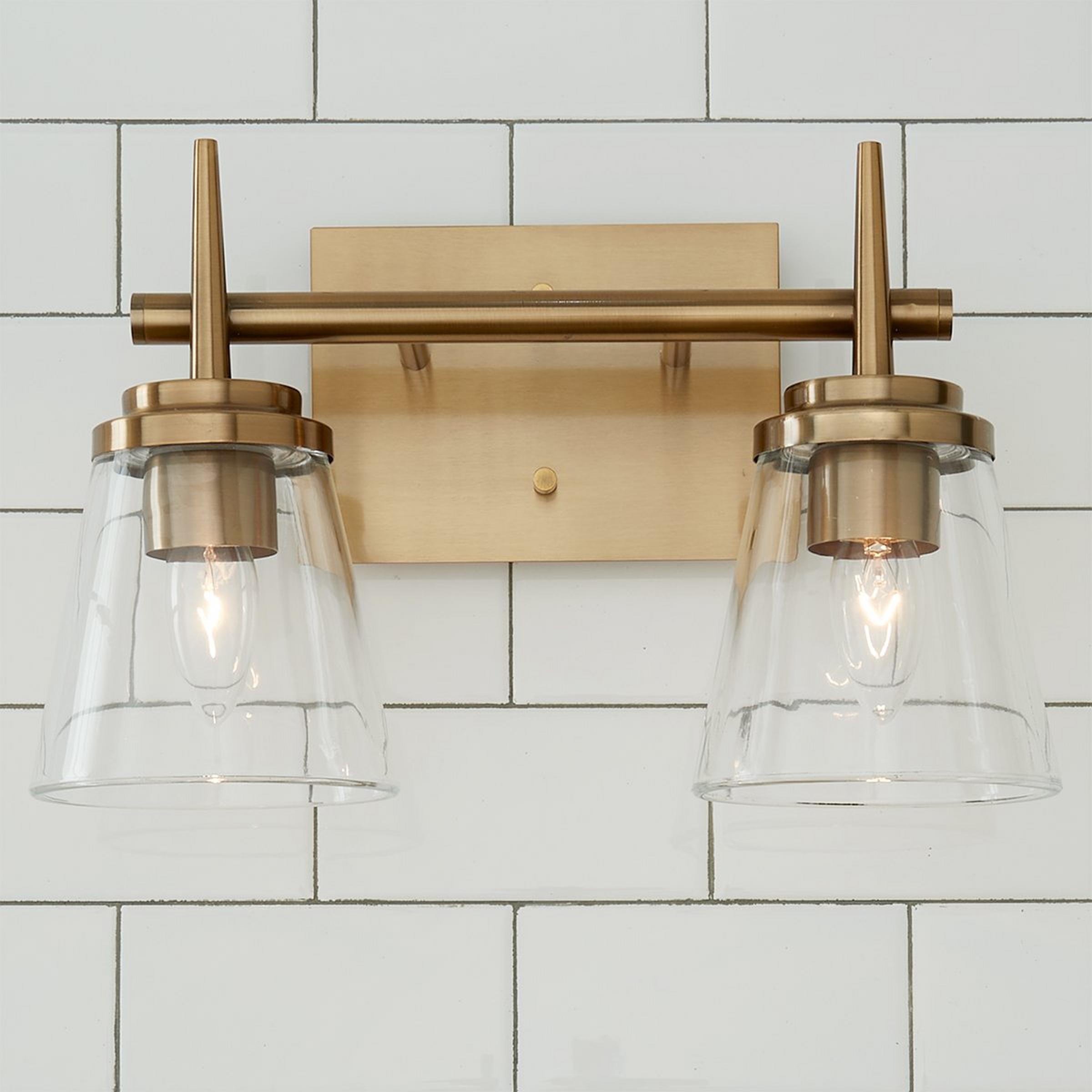 Bold, rounded spikes positioned above the lamps complement the soft taper of the clear glass shades in this stylish bath fixture. A brushed gold finish adds gleaming texture and pairs with the striking design to match this light to glam, modern, transitional, and vintage spaces.