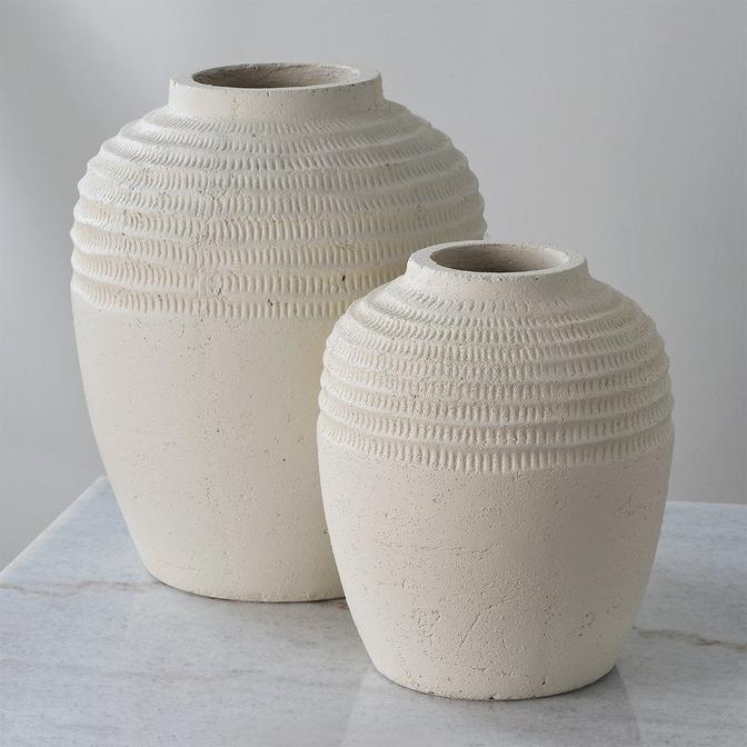 Elegant, yet rustic, these chalky white finished ceramic vases bring an artisinal touch to any space. Perfect for displaying florals or standing alone as a statement piece. Sizes: S-9x11x9, L-12x14x12