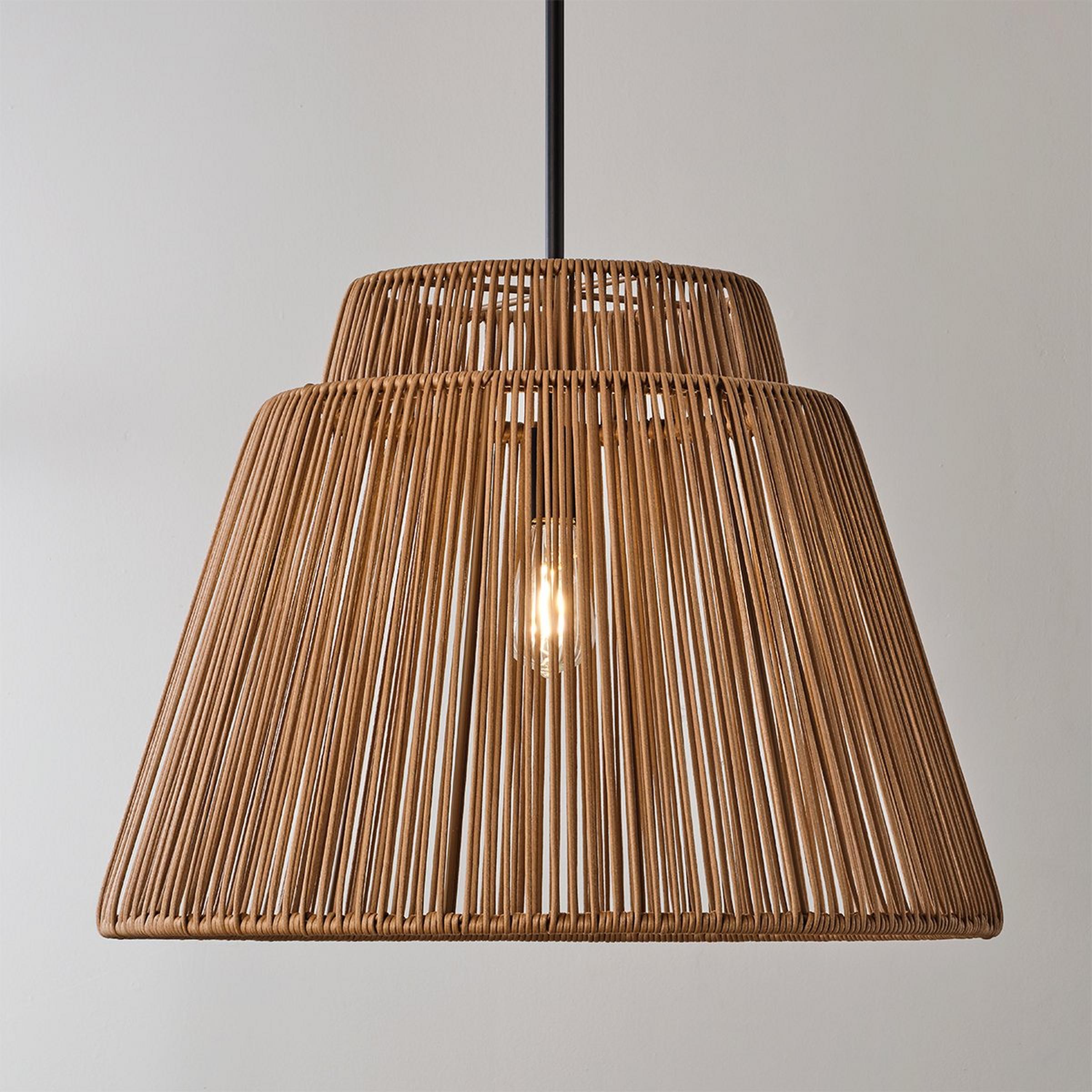 This modern pendant showcases a textural hand-wrapped shade as it hangs over a sunroom or porch. Whether installed outdoors or in, the synthetic materials are durable and the light shines dazzlingly.