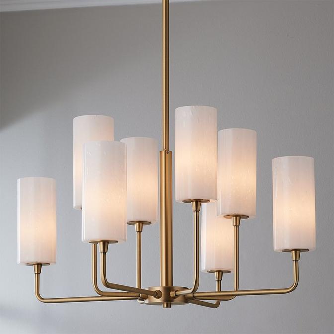 Our Thayer Collection has mid-century air with clean lines and soft tones. The angled arms hold opaque, seeded glass cylinders to warm each light and create a bright glow in your space. For a cohesive aesthetic, pair the chandelier and sconce in your dining room to unite your theme.
