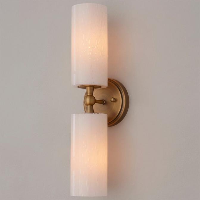 Our Thayer Collection has mid-century air with clean lines and soft tones. The angled arm holds an opaque, seeded glass cylinder to warm the light and create a bright glow in your space. For a cohesive aesthetic, pair the chandelier and sconce in your dining room to unite your theme.