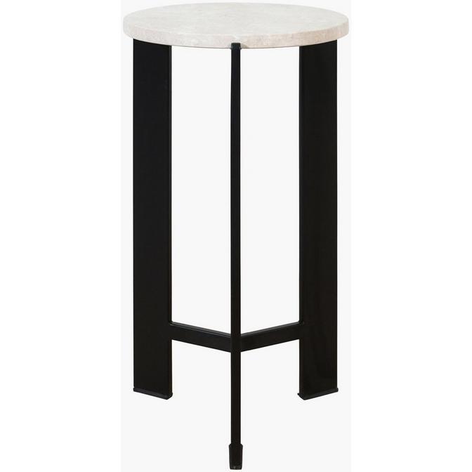 The legs of this drink table are thoughtfully designed at an angle, enhancing its slender silhouette with a dynamic look that still boasts a minimalist feel. The striking angular legs ensure stability without compromising style, giving this functional accent piece a distinctive personality. The table's compact form allows it to fit seamlessly next to couches and accent chairs, while the simple silhouette highlights the bold material of the tabletop. With its velvety tonal variations and subtle natural veining, the marble tabletop's unique coloring elevates this design.