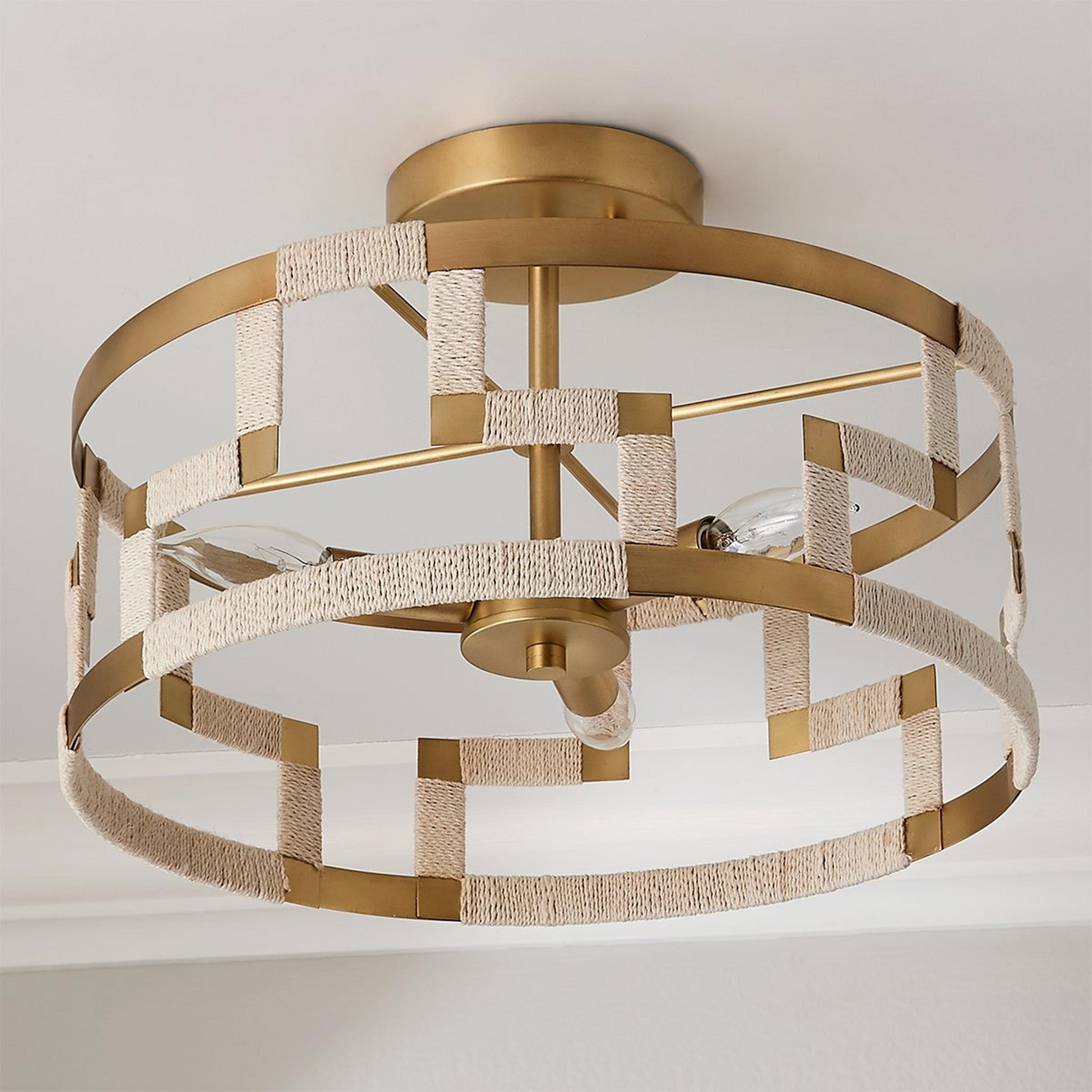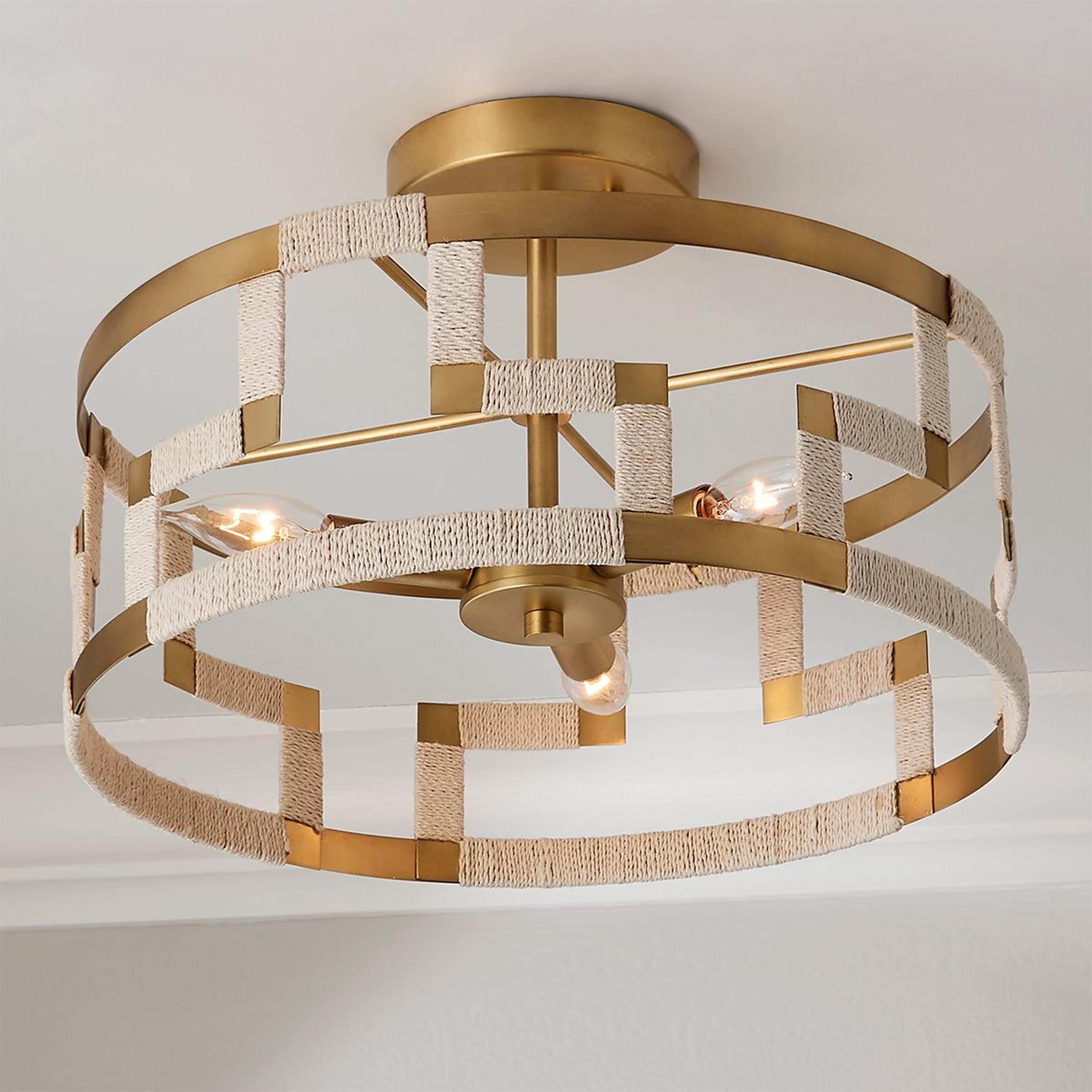 Greek key design takes on a new form in our Threaded Grid Collection. The striking pattern-work is bold yet softened with the natural jute rope wrapped in combination with the hand-applied brass patina. Beyond unique, these fixtures will command attention in your modern or transitional atmosphere. This fixture is able to transform from a semi-flush ceiling light to a foyer chandelier. This item can be hung on a sloped ceiling only when used as a chandelier.