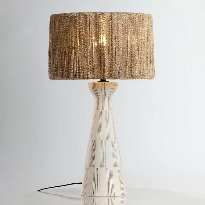 The Tiernan Table Lamp showcases warm neutrals and linear detailing, emphasizing both texture and verticality. The natural abaca rope, wrapped around a drum-shaped frame, shades a central bulb above a slender ceramic base. The lines painted on the body mimic the rope in a way that harmoniously draws together disparate materials in order to beautify the home.