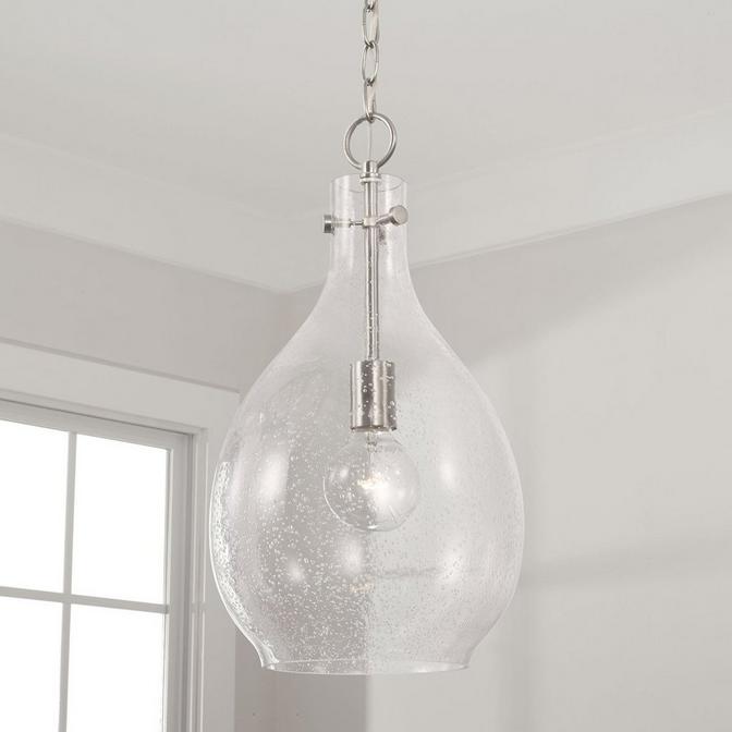 The sculptural style of the Tierni Pendant is stunning from every angle. The textured, seeded glass shade is complemented by a teardrop design, creating a classically contoured look that balances form and function.