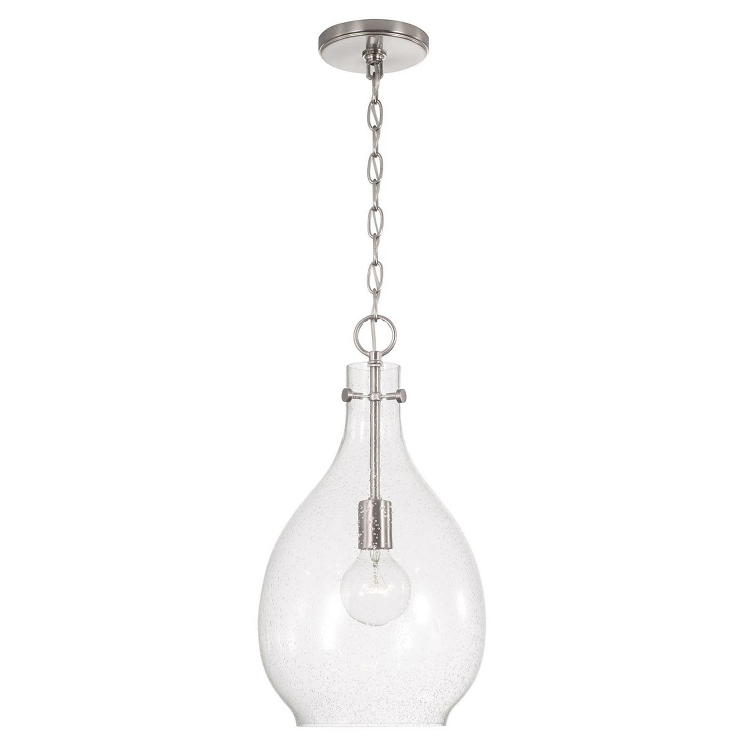 The sculptural style of the Tierni Pendant is stunning from every angle. The textured, seeded glass shade is complemented by a teardrop design, creating a classically contoured look that balances form and function.