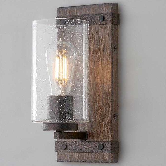 Our Timber Bath Sconce is a rustic fixture that will fit snug into a farmhouse themed bathroom. The rectangular backplate has steel accents in dark finishes, bringing out a lodge persona. Seeded glass shades allow the light to shine with an unclouded brilliance.
