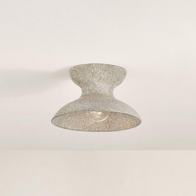 The Timok Ceiling Light consists of a central ceramic dome that shines light downward to create moody lighting in any room. The ceramic glaze features a crackling pattern of dark lines that run like a mosaic across the surface, reminiscent of traditional Japanese Raku clay fired pottery. Due to the nature of the crackling process, which is a result of firing method or of an intentional mix of glazing chemistry, no two will have an identical pattern, and each one is celebrated as a one-of-a-kind piece.