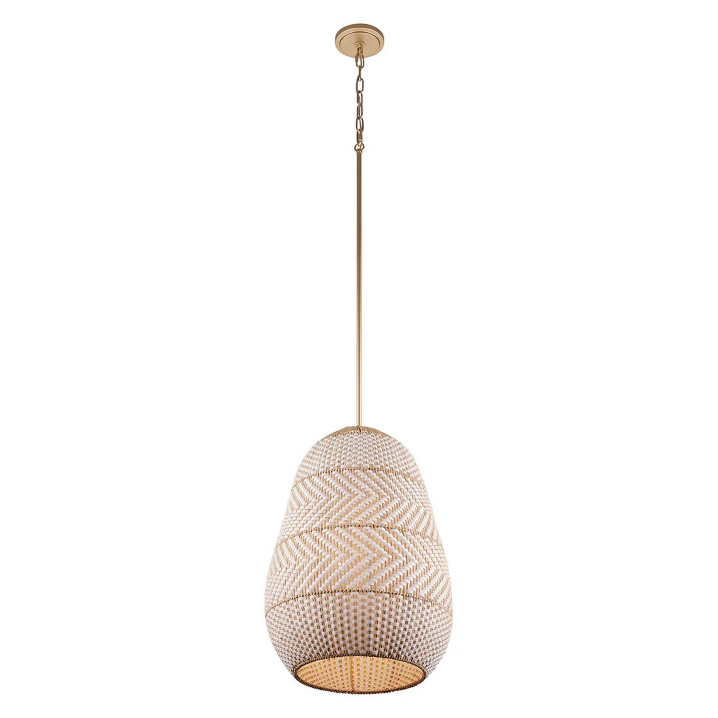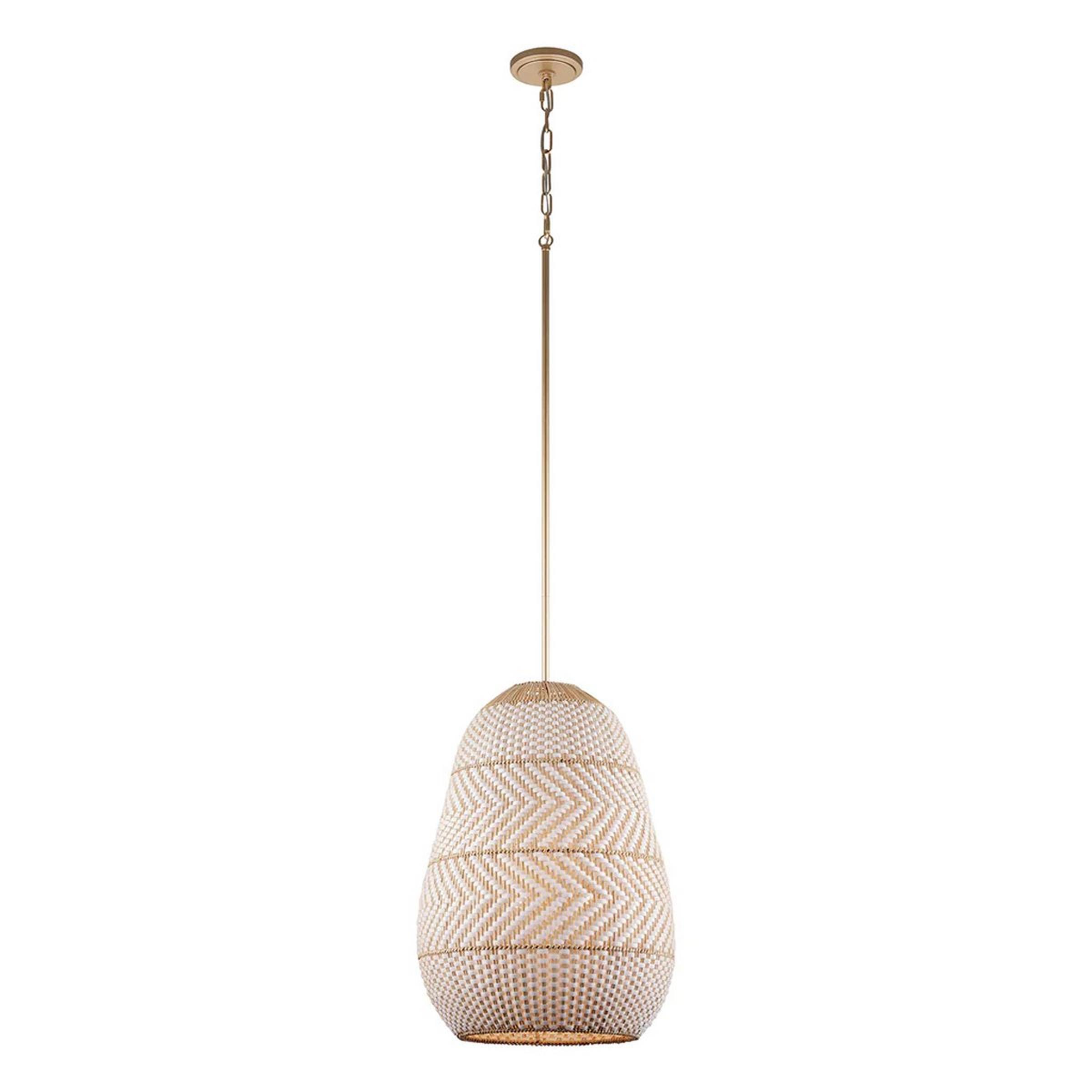 Applying a neutral color palette to complement its bold design, this tropical pendant's striking woven pattern on a broad shade is intricate and delightful! Handwoven from lanyard and rattan for artistic perfection, this light is ideal for adding a boho feel to a kitchen or breakfast nook. This piece serves as a dramatic centerpiece, whether styled alone or layered in pairs.